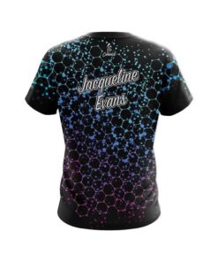 Stay 40% cooler with CoolWick. Our Jacqueline Evans Storm Black Molecules CoolWick Replica Bowling Jerseys are made of two different fabrics with the back being our CoolWick technology fabric that helps wick moisture away and helps air flow more easily through the fibers.