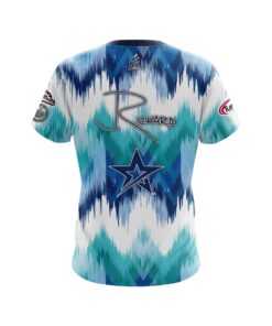 Stay 40% cooler with CoolWick. Our Jordan Richard Star Blue Teal Zig Zag Replica CoolWick Bowling Jerseys are made of two different fabrics with the back being our CoolWick technology fabric that helps wick moisture away and helps air flow more easily through the fibers.