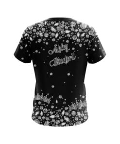 Stay 40% cooler with CoolWick. Our Signature Crown The Queen Black Diamond Ashley Blueford Bowling Jerseys are made of two different fabrics with the back being our CoolWick technology fabric that helps wick moisture away and helps air flow more easily through the fibers.