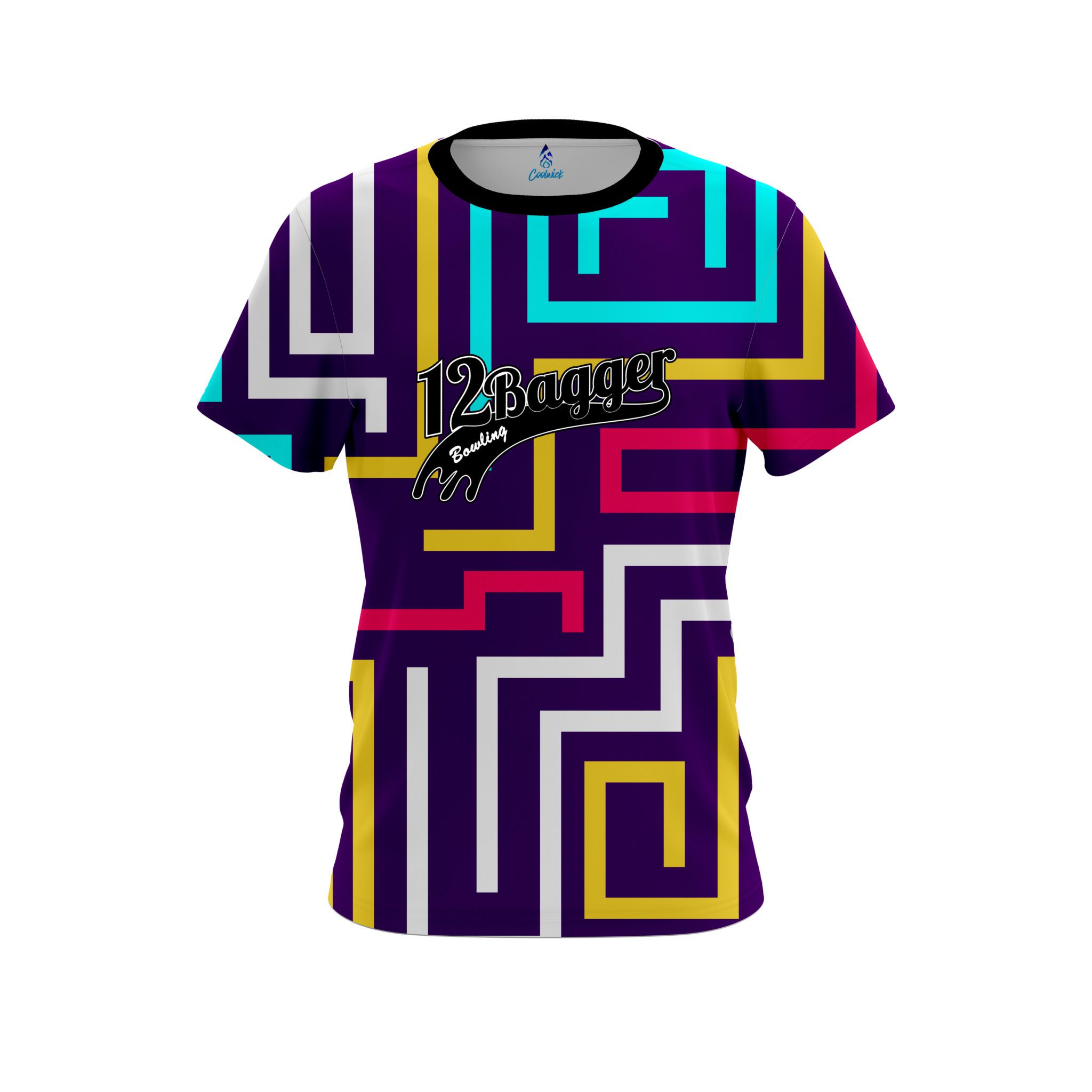 Stay 40% cooler with CoolWick. Our 12Bagger Bowling Line Maze Coolwick Jerseys are made of two different fabrics with the back being our CoolWick technology fabric that helps wick moisture away and helps air flow more easily through the fibers.
