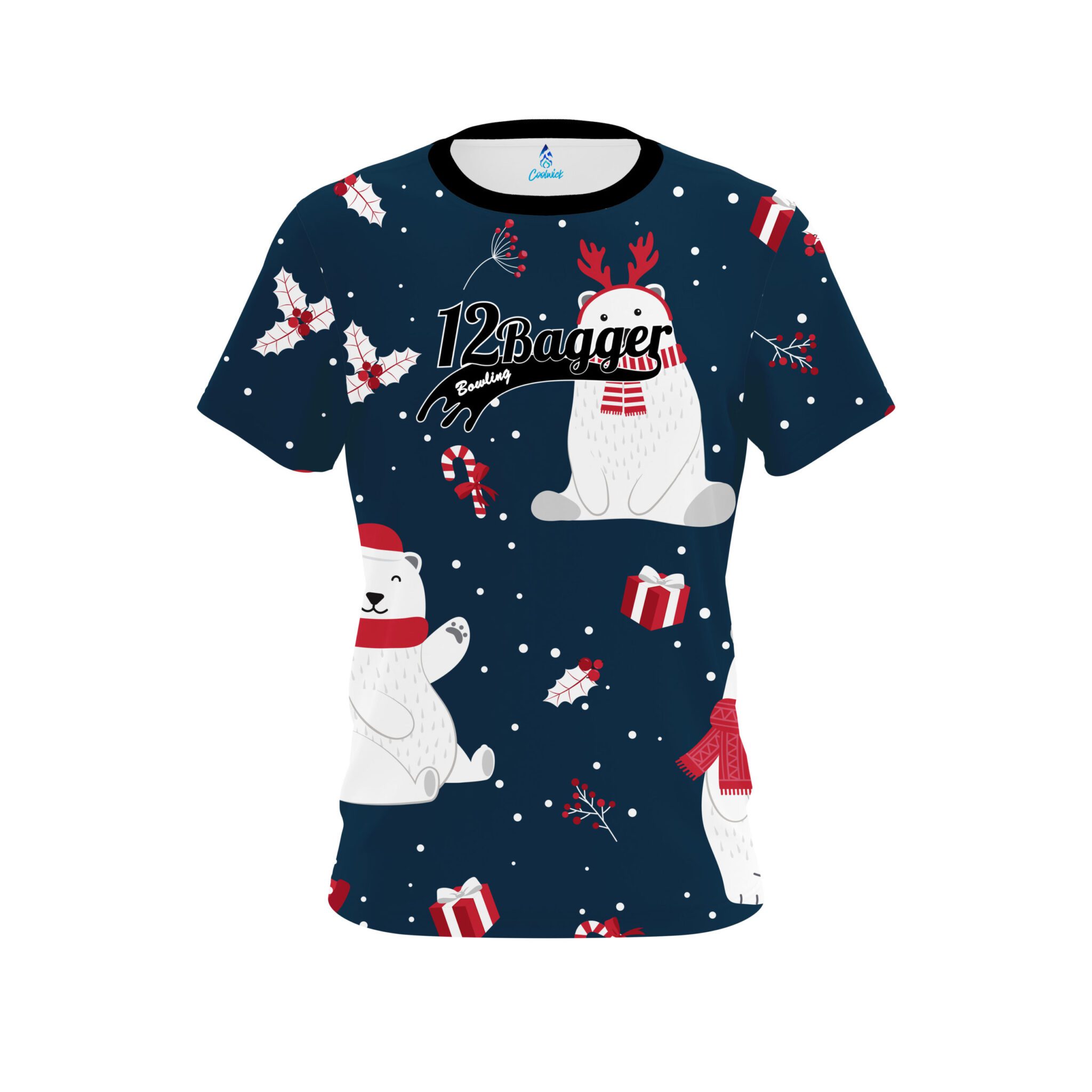 Stay 40% cooler with CoolWick. Our 12Bagger Polar Bear Xmas CoolWick Bowling Jersey are made of two different fabrics with the back being our CoolWick technology fabric that helps wick moisture away and helps air flow more easily through the fibers.