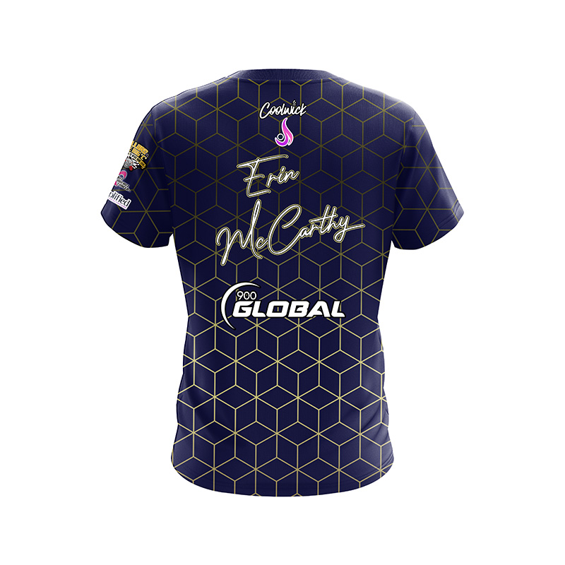 Bowl like the pros with our signature replica jerseys! Introducing the 900 Global Erin McCarthy Navy Gold Hex CoolWick Bowling Jersey – designed with innovative fabrics for superior performance. Our dye-sublimated replica bowling jersey features the cutting-edge CoolWick technology fabric. You will be staying 40% cooler as it efficiently wicks away moisture and improves airflow.