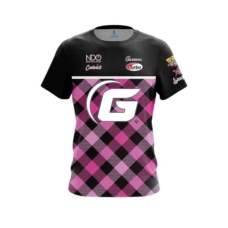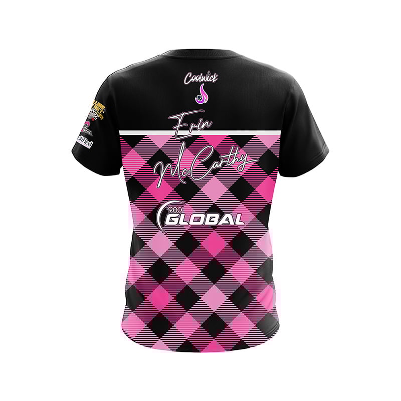 Shop now and elevate your game with the 900 Global Erin McCarthy Pink Plaid CoolWick Bowling Jersey – exceeding the benchmark of performance and style.