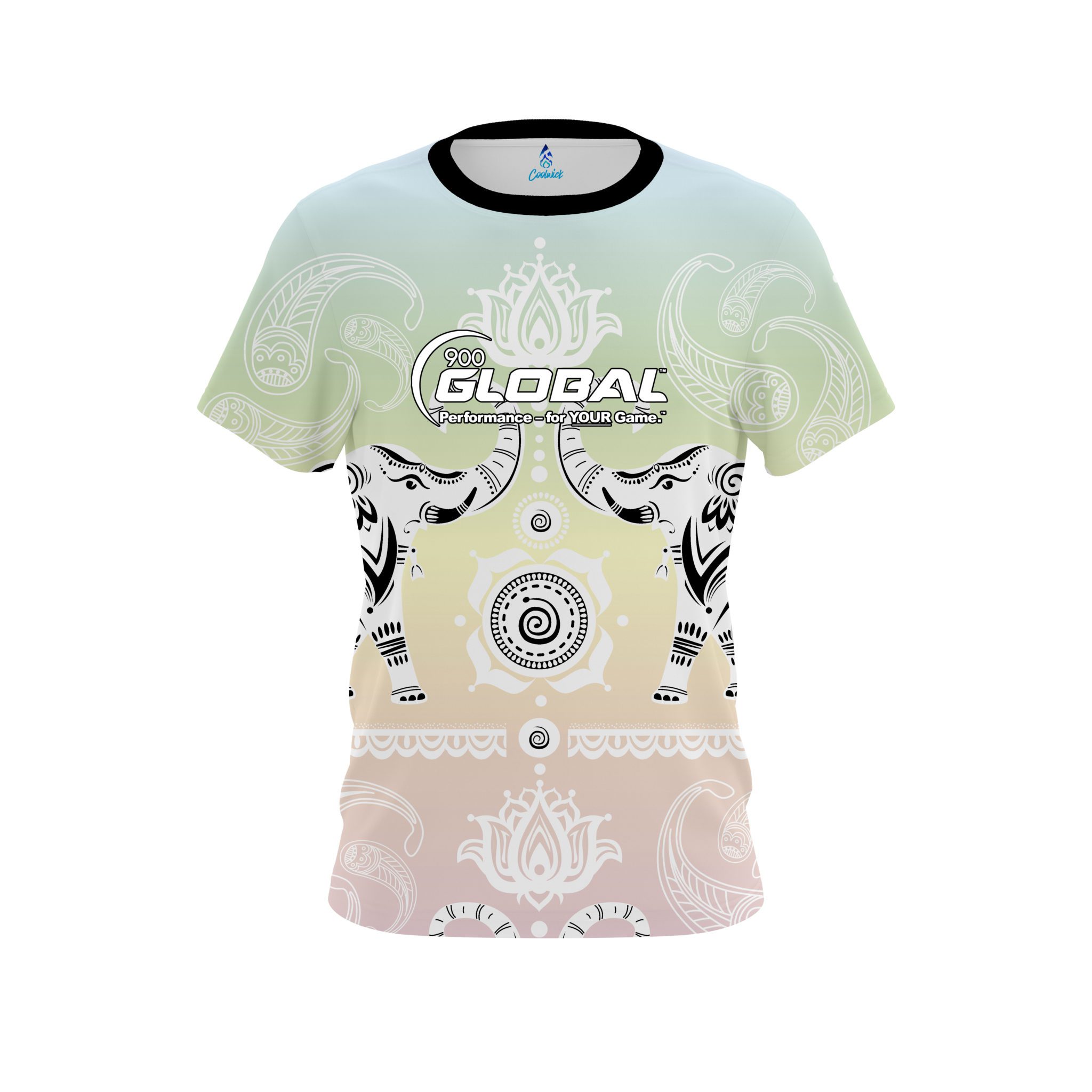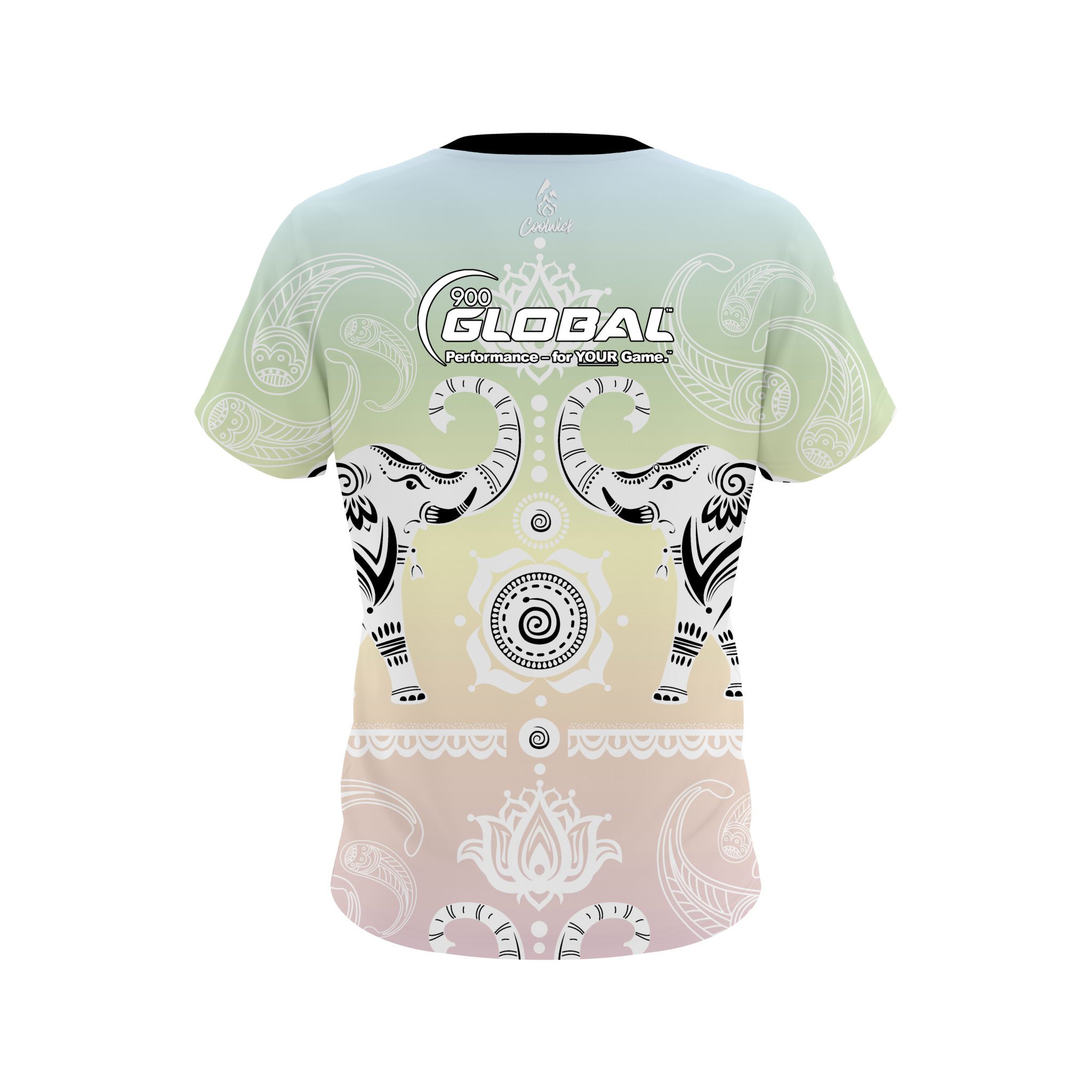 Stay 40% cooler with CoolWick. Our 900 Global Tribal Elephants Pastel Rainbow CoolWick Bowling Jersey are made of two different fabrics with the back being our CoolWick technology fabric that helps wick moisture away and helps air flow more easily through the fibers.