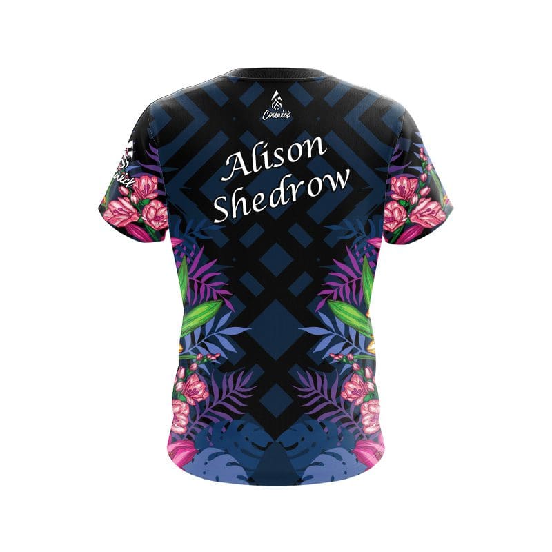 Designed, cut and sewn by hand stay 40% cooler with CoolWick. Our Alison Shedrow Tropical Floral Leaves CoolWick Bowling Jerseys are made of two different fabrics. The back being our CoolWick technology fabric that helps wick moisture away and helps air flow more easily through the fibers.