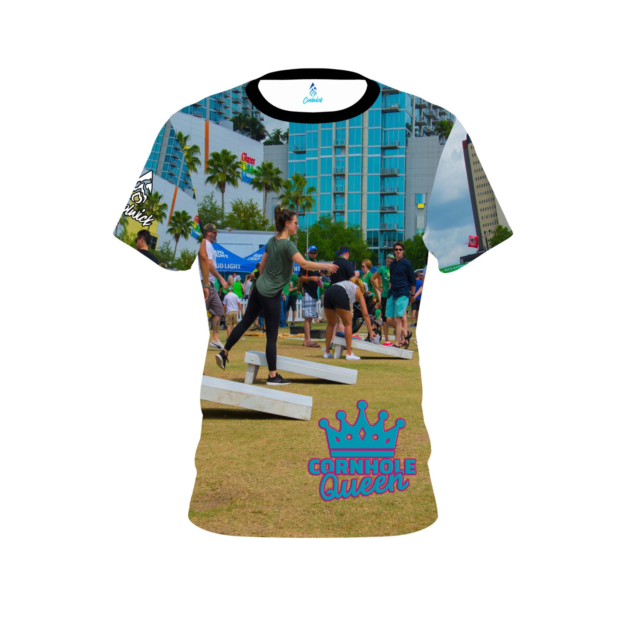 Stay 40% cooler with CoolWick. Our Beach Cornhole Queen Coolwick Jerseys are made of two different fabrics with the back being our CoolWick technology fabric that helps wick moisture away and helps air flow more easily through the fibers.