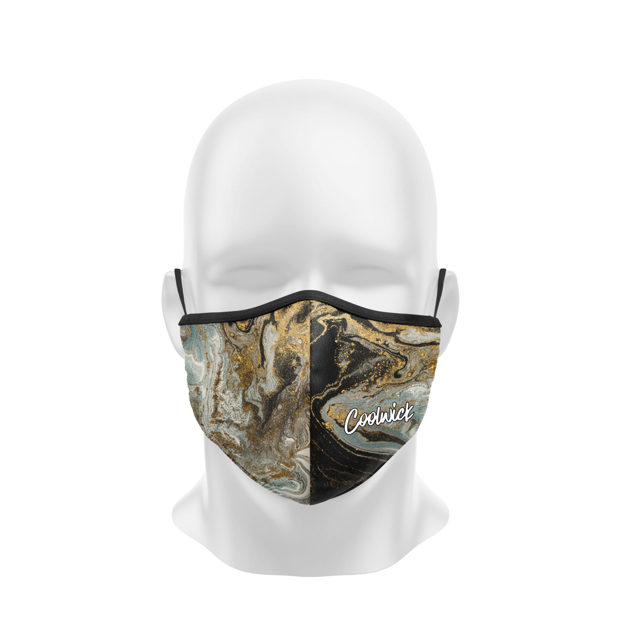 Stay 40% cooler with CoolWick. Our Black Gold Marble dye sublimated masks are two-ply and 100% polyester that covers the wearer’s nose and mouth. Our masks are made of fabric that helps wick moisture away and helps air flow more easily through the fibers. The fabric binding has a slight stretch, while ear loops and a center seam help hold it comfortably in place all day.