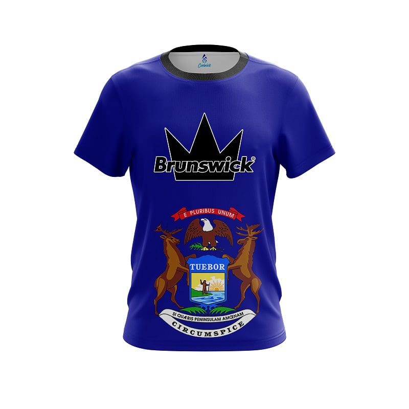 Stay 40% cooler with CoolWick. Our Brunswick Michigan Flag CoolWick Bowling Jersey are made of two different fabrics with the back being our CoolWick technology fabric that helps wick moisture away and helps air flow more easily through the fibers.
