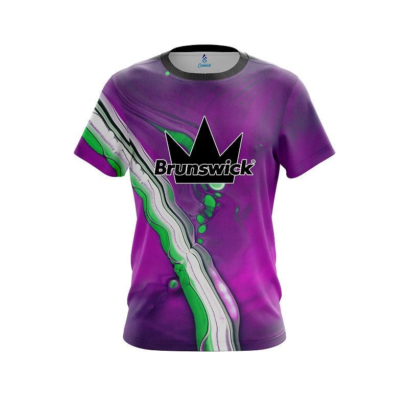 Stay 40% cooler with CoolWick. Our Brunswick Purple And Green Liquid CoolWick Bowling Jerseys are made of two different fabrics with the back being our CoolWick technology fabric that helps wick moisture away and helps air flow more easily through the fibers.