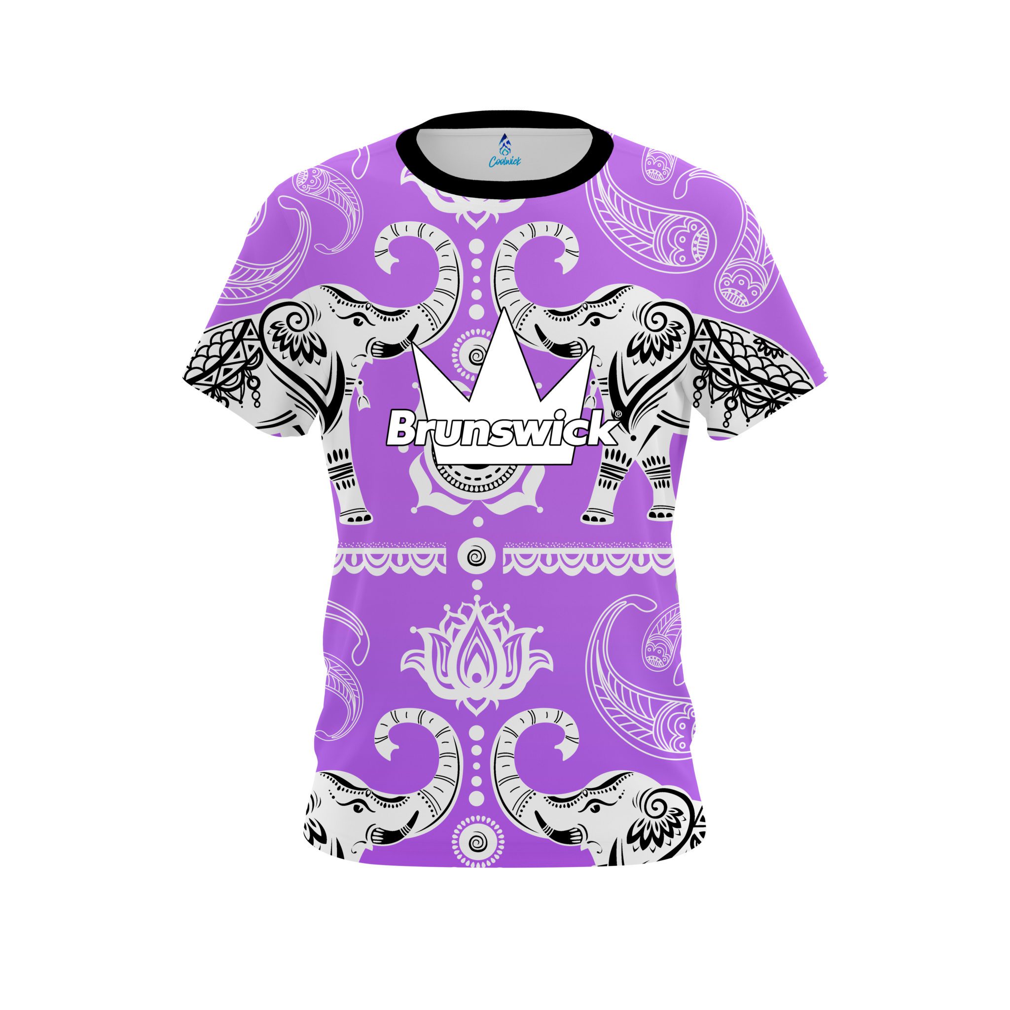 Stay 40% cooler with CoolWick. Our Brunswick Tribal Elephants Purple CoolWick Bowling Jersey are made of two different fabrics with the back being our CoolWick technology fabric that helps wick moisture away and helps air flow more easily through the fibers.