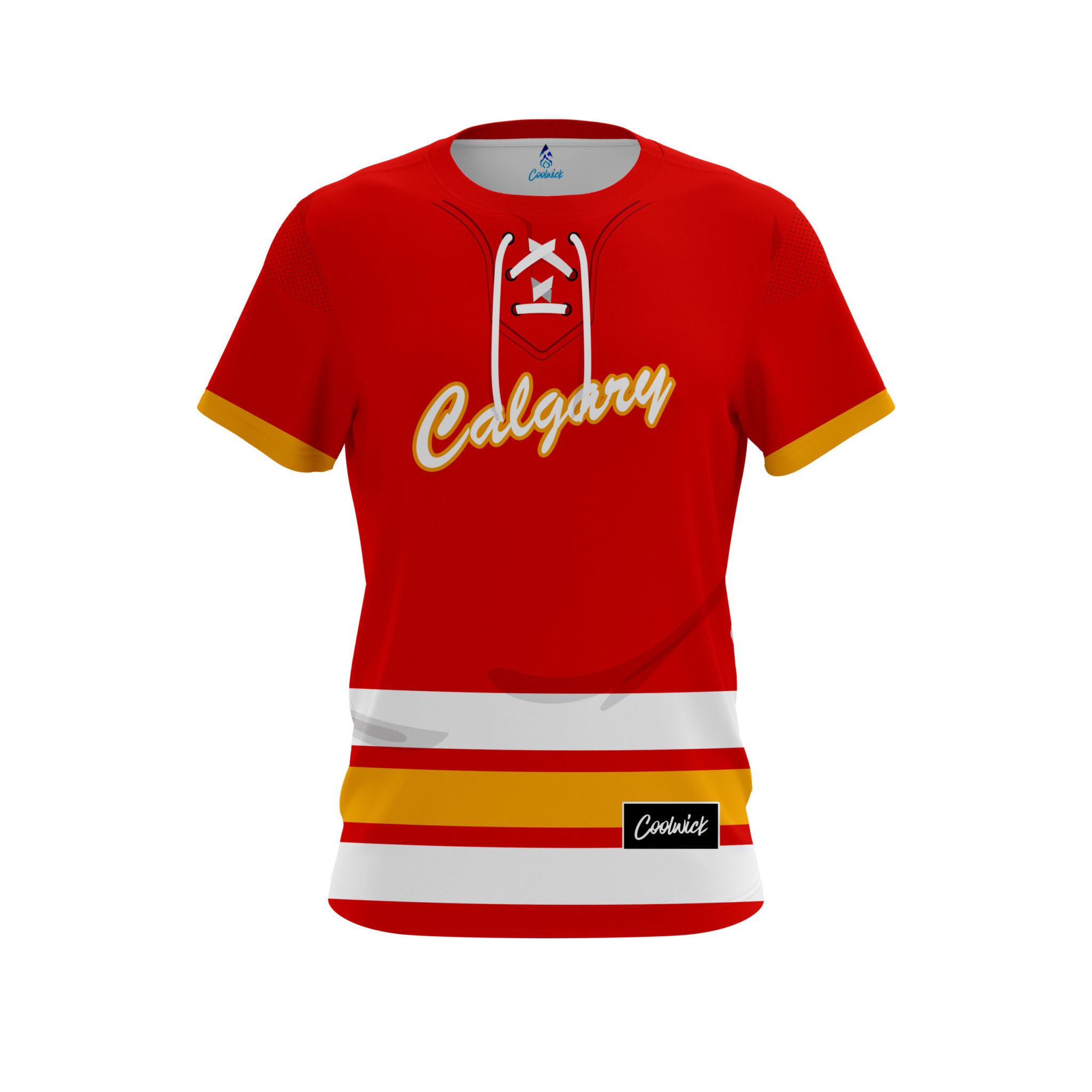 Designed, cut and sewn by hand stay 40% cooler with CoolWick. Our Calgary Hockey Coolwick Bowling Jerseys are made of two different fabrics with the back being our CoolWick technology fabric that helps wick moisture away and helps air flow more easily through the fibers.