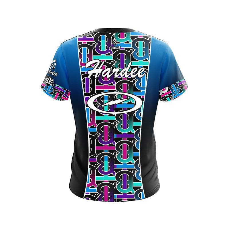 Designed, cut and sewn by hand stay 40% cooler with CoolWick. Our Christina Hardee Gradient Glamour CoolWick Bowling Jerseys are made of two different fabrics. The back being our CoolWick technology fabric that helps wick moisture away and helps air flow more easily through the fibers.
