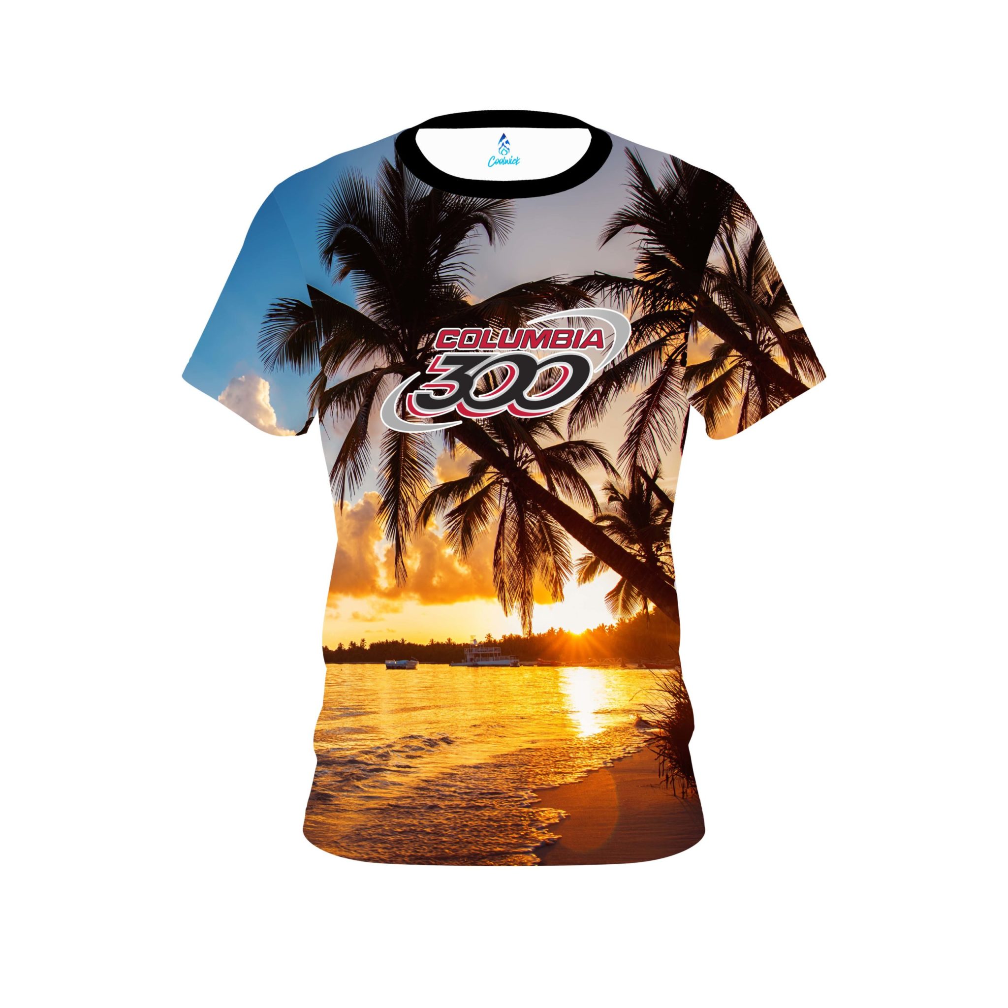 Stay 40% cooler with CoolWick. Our Columbia 300 Sunset Palm Trees CoolWick Bowling Jerseys are made of two different fabrics with the back being our CoolWick technology fabric that helps wick moisture away and helps air flow more easily through the fibers.