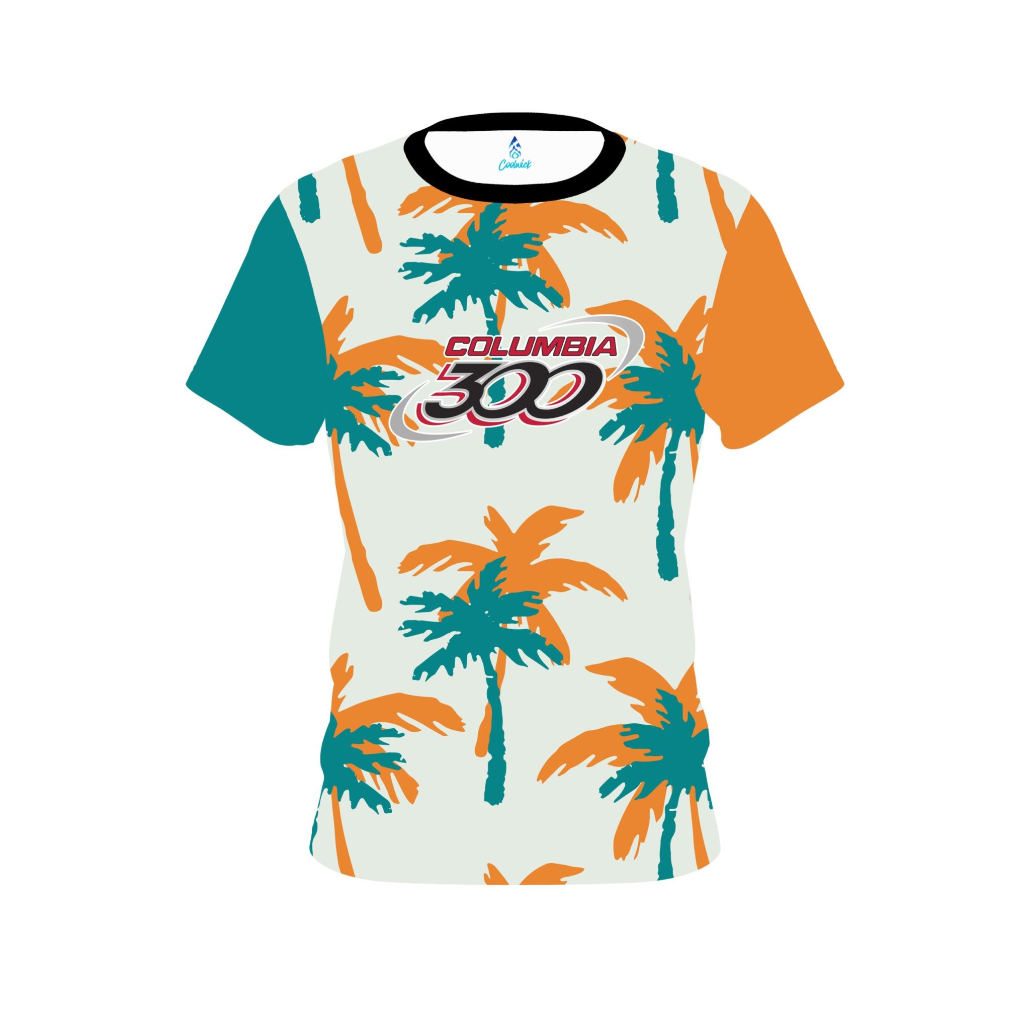 Stay 40% cooler with CoolWick. Our Columbia 300 Teal Orange Palm Trees CoolWick Bowling Jerseys are made of two different fabrics with the back being our CoolWick technology fabric that helps wick moisture away and helps air flow more easily through the fibers.