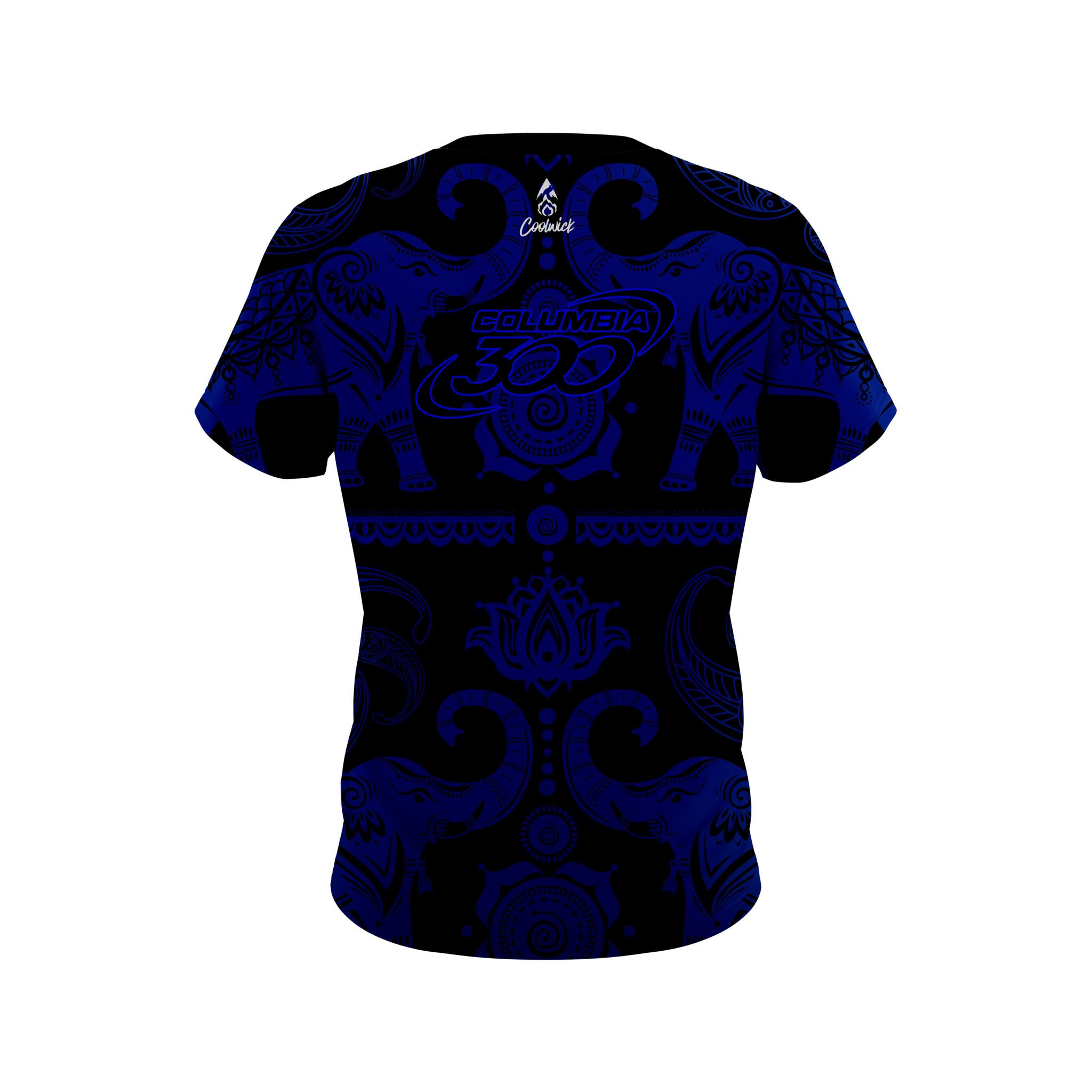 Stay 40% cooler with CoolWick. Our Columbia 300 Tribal Elephants Blue and Black CoolWick Bowling Jersey are made of two different fabrics with the back being our CoolWick technology fabric that helps wick moisture away and helps air flow more easily through the fibers.