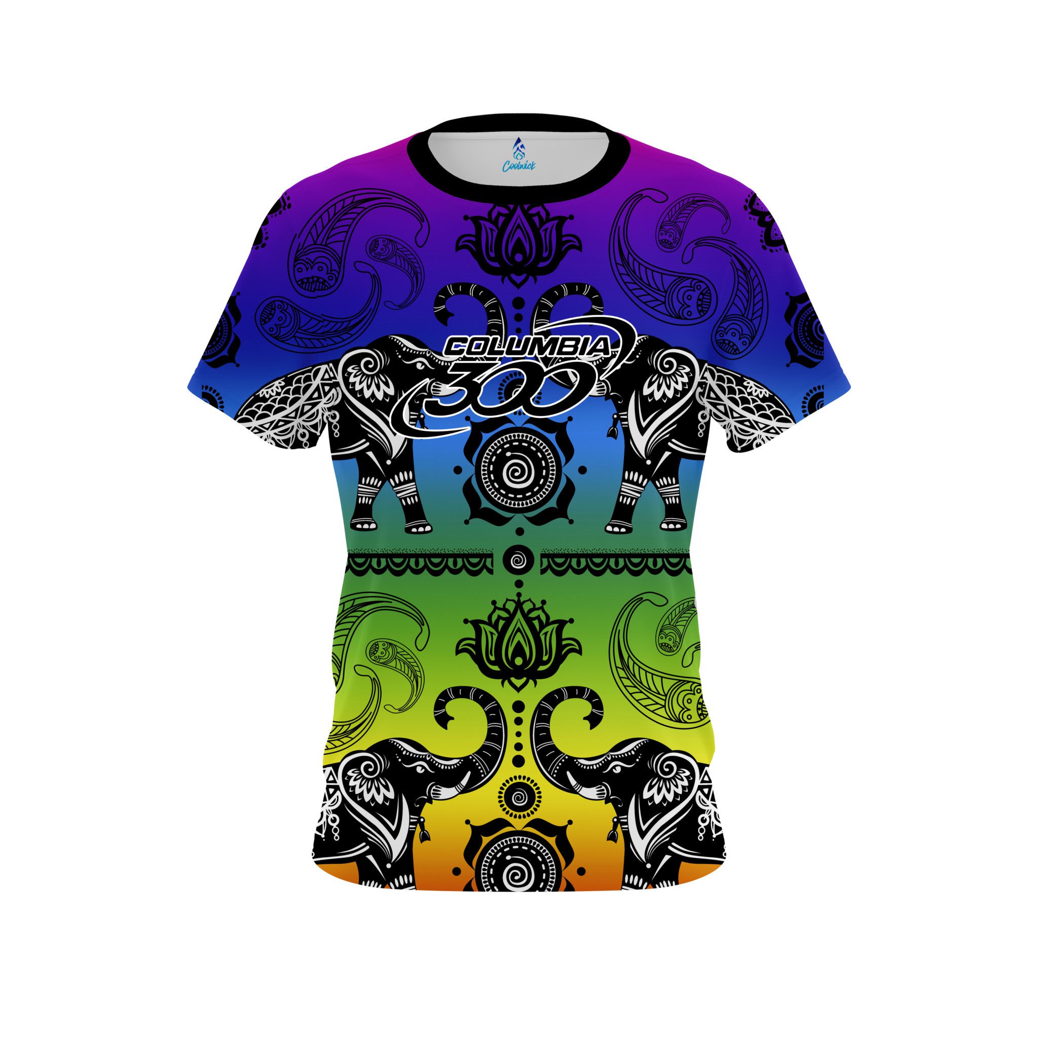 Stay 40% cooler with CoolWick. Our Columbia 300 Tribal Elephants Rainbow CoolWick Bowling Jersey are made of two different fabrics with the back being our CoolWick technology fabric that helps wick moisture away and helps air flow more easily through the fibers.