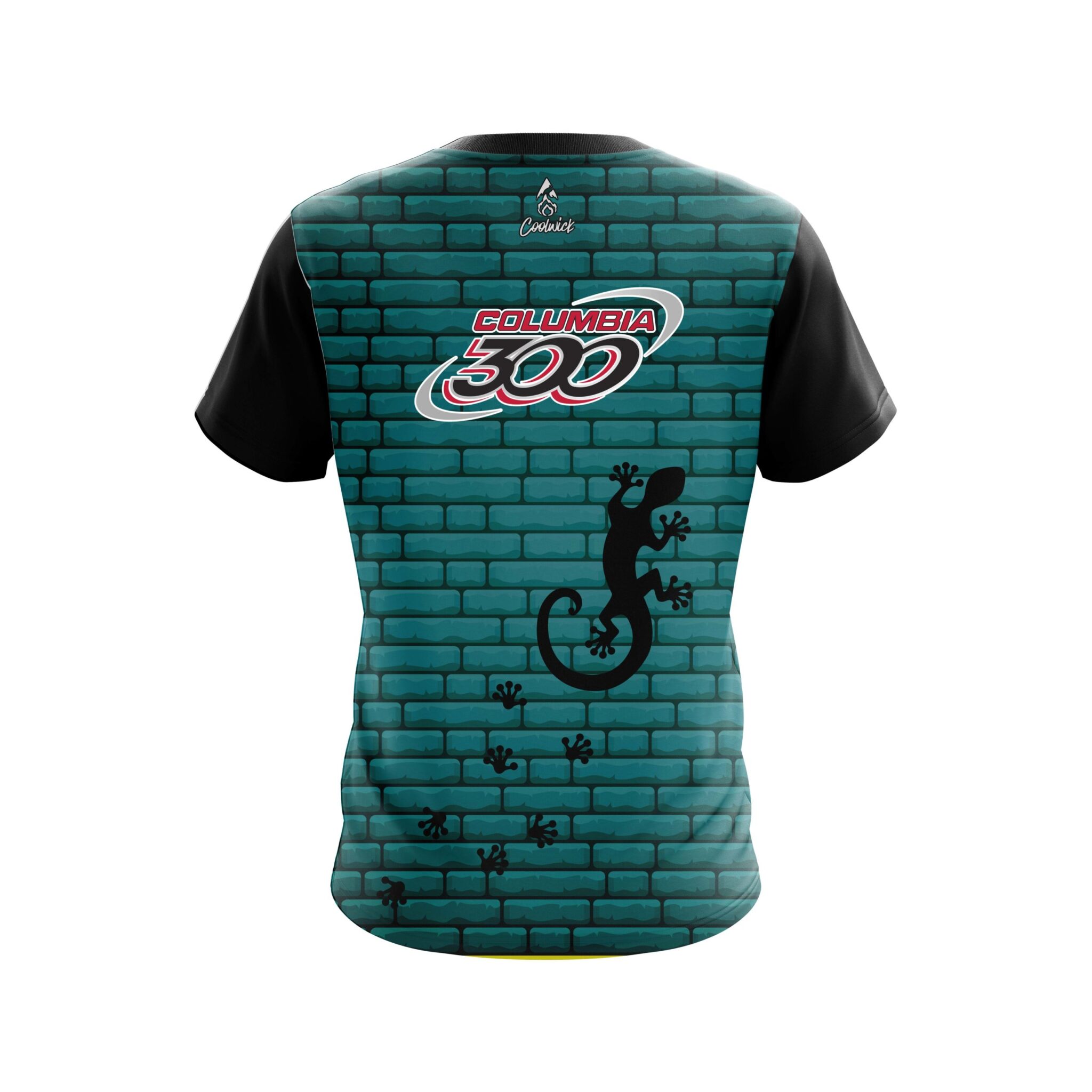 Stay 40% cooler with CoolWick. Our Columbia 300 Turq Bricks Gecko CoolWick Bowling Jerseys are made of two different fabrics with the back being our CoolWick technology fabric that helps wick moisture away and helps air flow more easily through the fibers.
