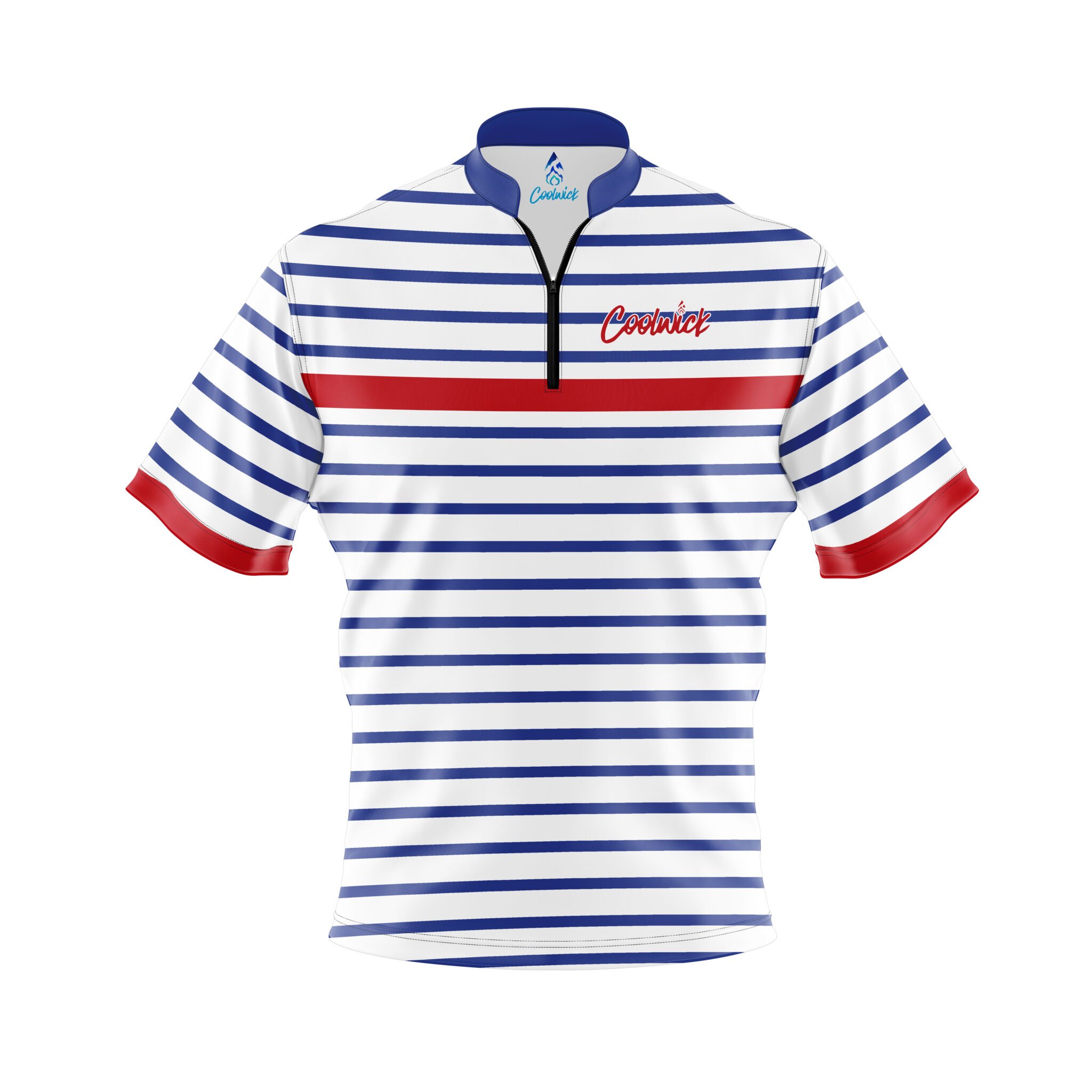 We are thrilled to introduce the newest addition to our iconic CoolWick Elite line! Behold the CoolWick Elite Red Stripe Navy White Sash Zip Jersey, a vibrant recreation inspired by the success of our quarter 3 2022 Red Stripe jerseys. This jersey showcases fresh colors while maintaining its timeless design. Carefully crafted with premium materials, this product proudly features a distinctive sash zip collar.
