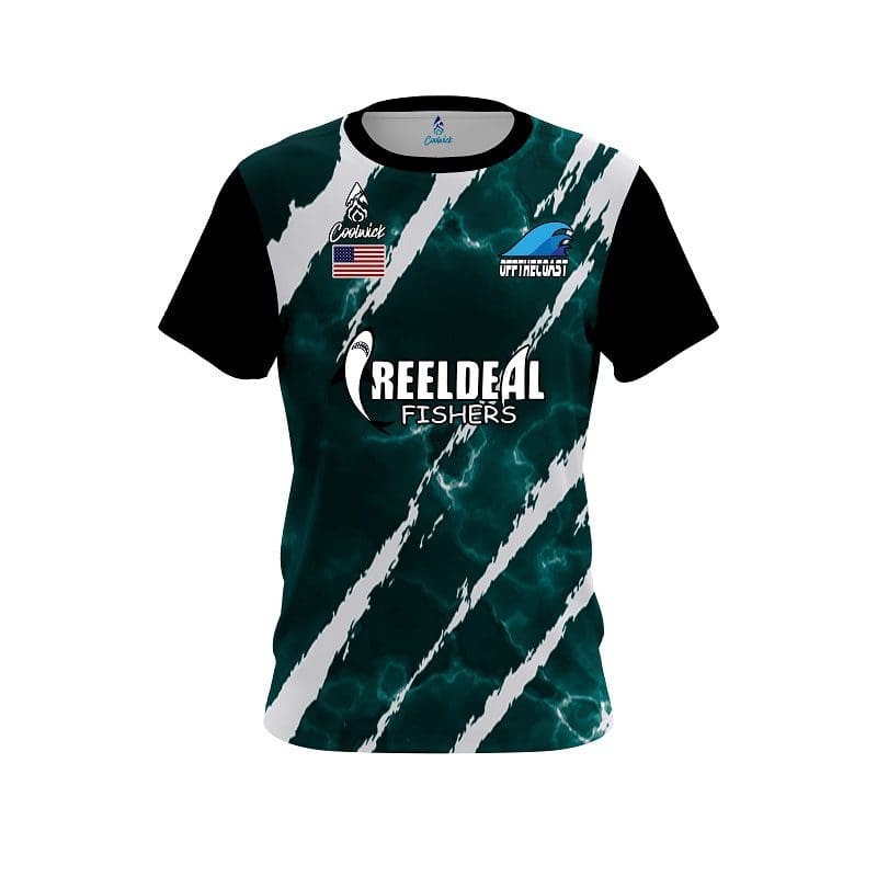Stay 40% cooler with CoolWick. Our CoolWick Reel Deal Marble Aqua Fisher CoolWick Fishing Jerseys are made of two different fabrics with the back being our CoolWick technology fabric that helps wick moisture away and helps air flow more easily through the fibers.