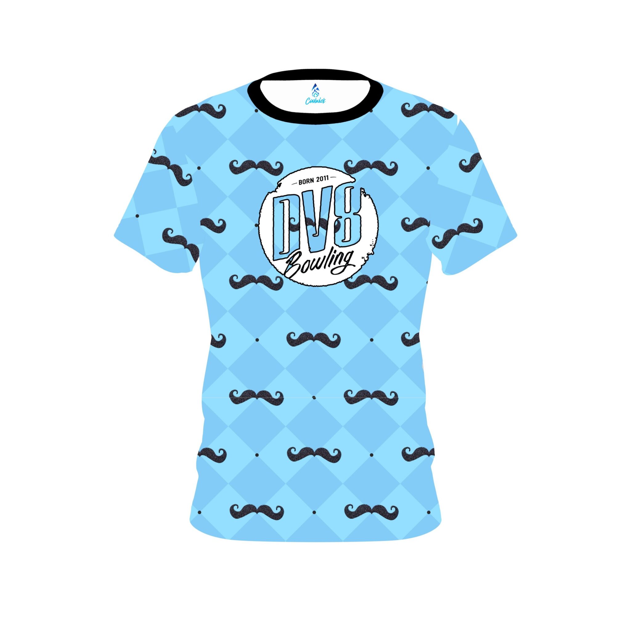 Stay 40% cooler with CoolWick. Our DV8 Baby Blue Mustache CoolWick Bowling Jerseys are made of two different fabrics with the back being our CoolWick technology fabric that helps wick moisture away and helps air flow more easily through the fibers.