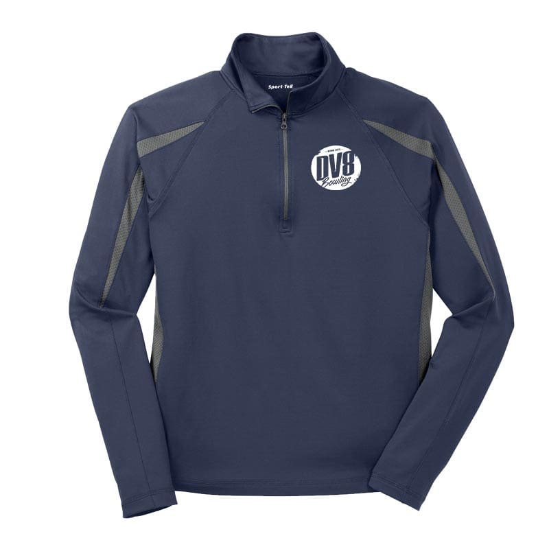 Get ready to roll in style with the DV8 Coolwick Logo Navy Grey Sport-Wick Stretch 1/2-Zip Colorblock Pullover! Perfect for any day at the lanes, this pullover is fashionable and functional. Whether you’re aiming for strikes or just want to look good for the camera, this bowling pullover is sure to make an impression!