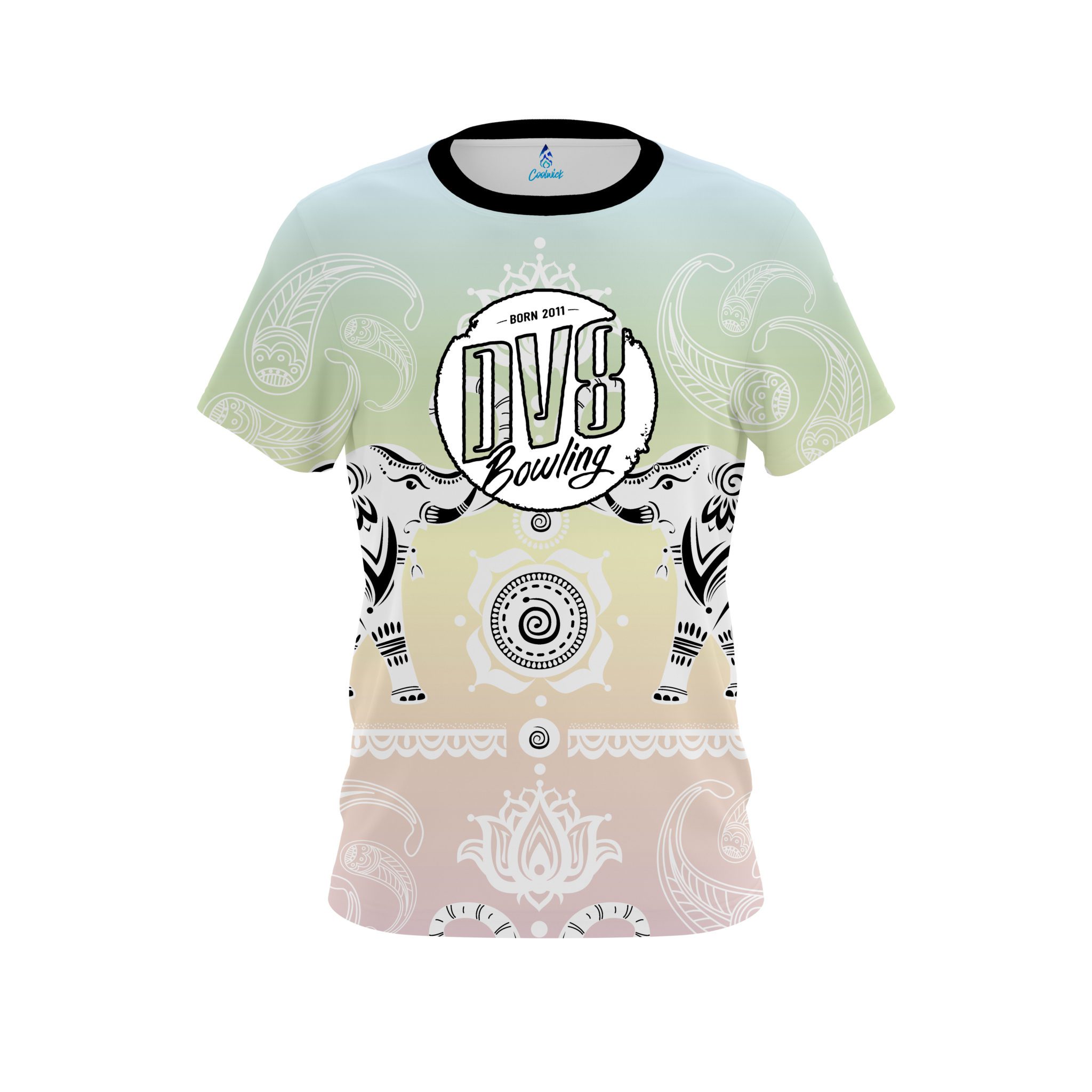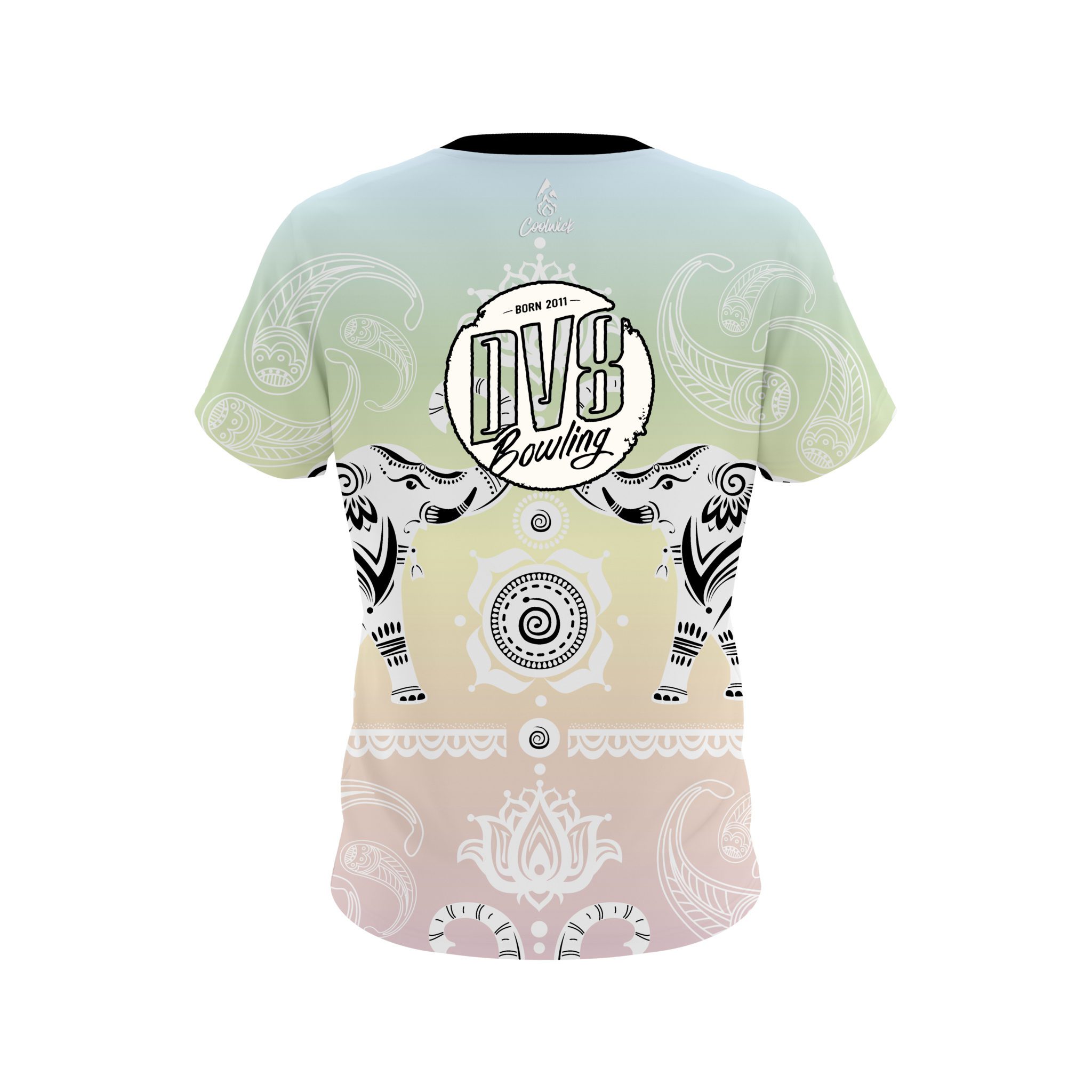 Stay 40% cooler with CoolWick. Our DV8 Tribal Elephants Pastel Rainbow CoolWick Bowling Jersey are made of two different fabrics with the back being our CoolWick technology fabric that helps wick moisture away and helps air flow more easily through the fibers.