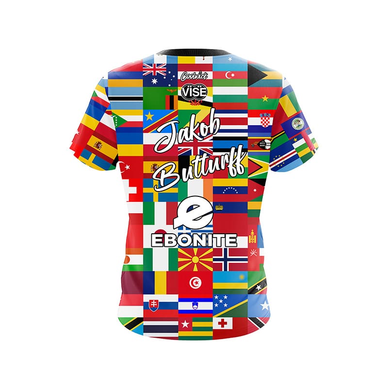 Shop now and elevate your game with the Ebonite Jakob Butturff All Over the World CoolWick Bowling Jersey – exceeding the benchmark of performance and style.