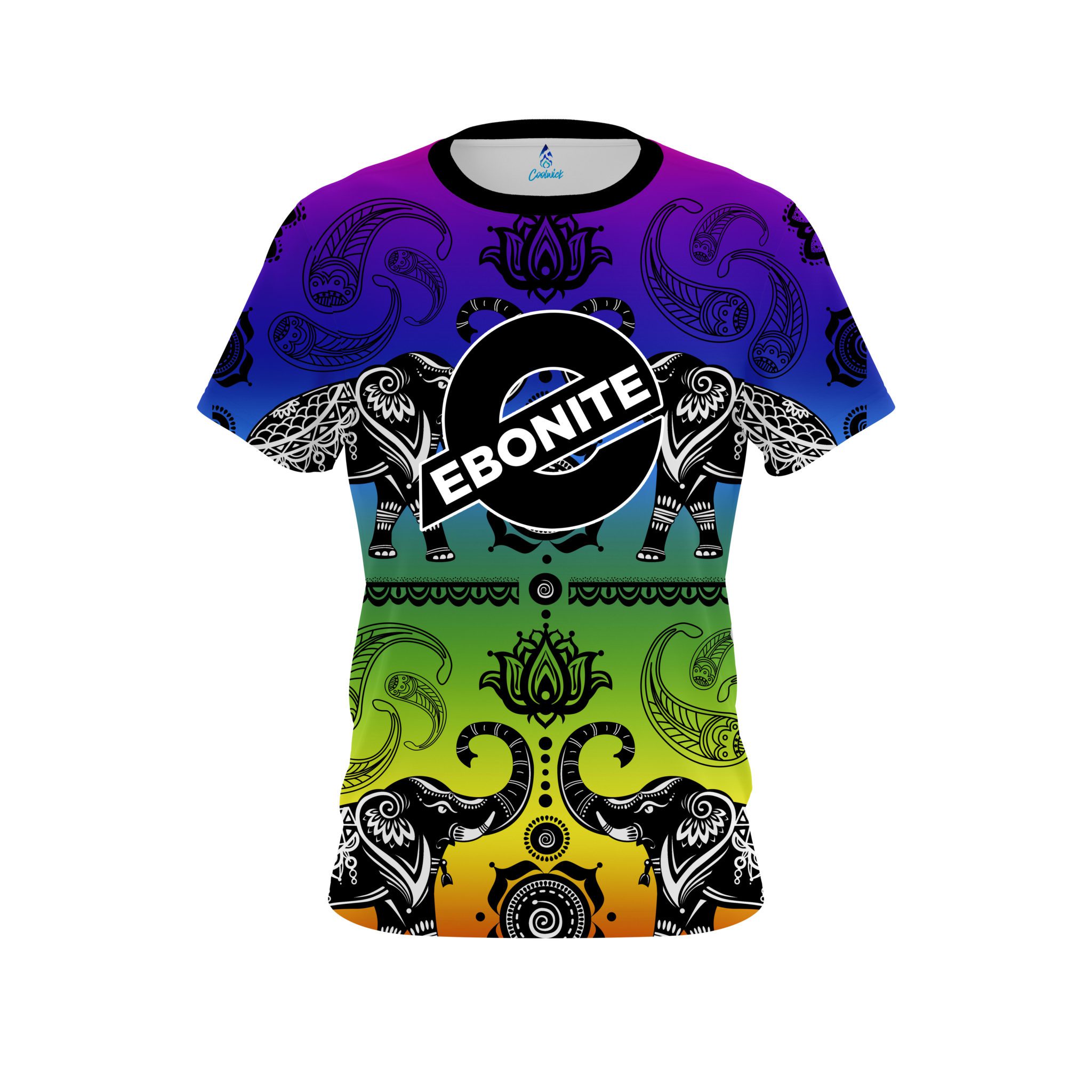 Stay 40% cooler with CoolWick. Our Ebonite Tribal Elephants Rainbow CoolWick Bowling Jersey are made of two different fabrics with the back being our CoolWick technology fabric that helps wick moisture away and helps air flow more easily through the fibers.