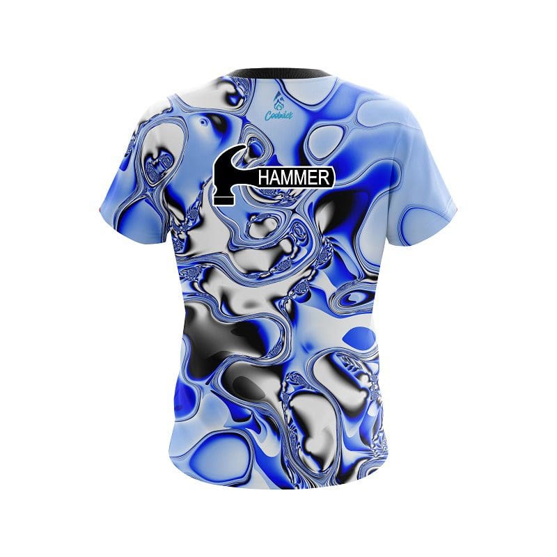 Stay 40% cooler with CoolWick. Our Hammer Blue And White Liquid Canvas CoolWick Bowling Jerseys are made of two different fabrics with the back being our CoolWick technology fabric that helps wick moisture away and helps air flow more easily through the fibers.