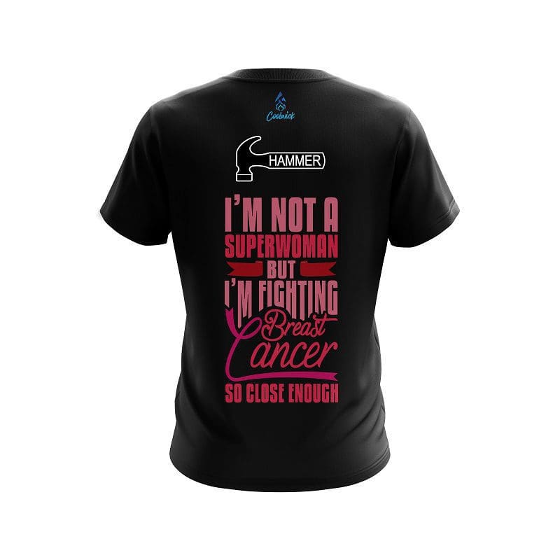 Stay 40% cooler with CoolWick. Our Hammer Breast Cancer Superwoman CoolWick Bowling Jerseys are made of two different fabrics with the back being our CoolWick technology fabric that helps wick moisture away and helps air flow more easily through the fibers.