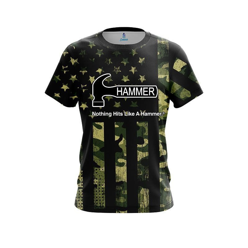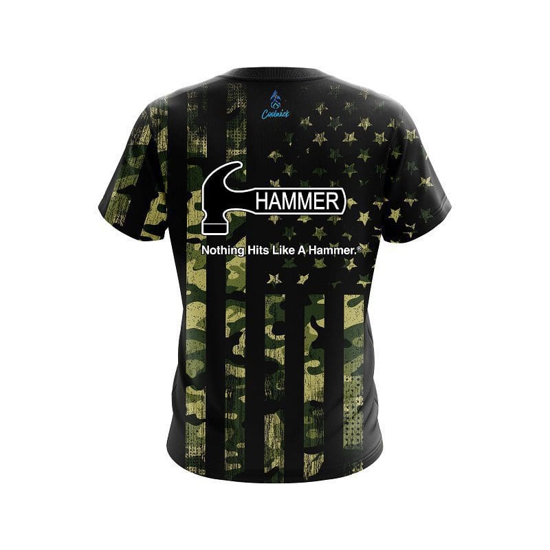 Stay 40% cooler with CoolWick. Our Hammer Camouflage Flag CoolWick Bowling Jerseys are made of two different fabrics with the back being our CoolWick technology fabric that helps wick moisture away and helps air flow more easily through the fibers.