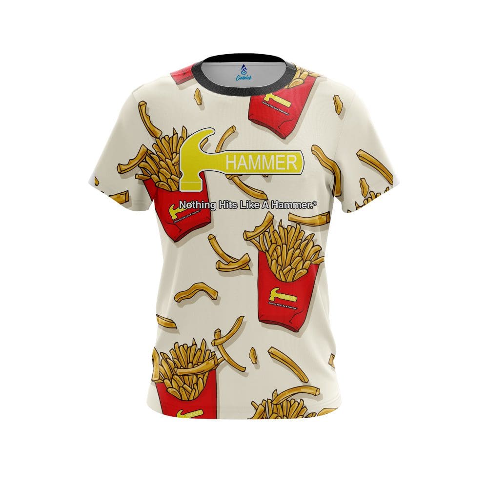 Stay 40% cooler with CoolWick. Our Hammer French Fries White CoolWick Bowling Jerseys are made of two different fabrics. The back being our CoolWick technology fabric that helps wick moisture away and helps air flow more easily through the fibers.