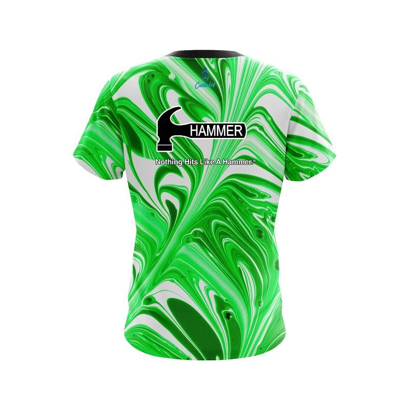 Stay 40% cooler with CoolWick. Our Hammer Green And White Liquid Swirls CoolWick Bowling Jerseys are made of two different fabrics with the back being our CoolWick technology fabric that helps wick moisture away and helps air flow more easily through the fibers.