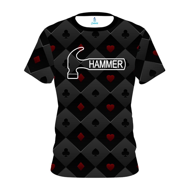 Stay 40% cooler with CoolWick. Our Hammer Logo Deck of Cards CoolWick Bowling Jerseys are made of two different fabrics with the back being our CoolWick technology fabric that helps wick moisture away and helps air flow more easily through the fibers.