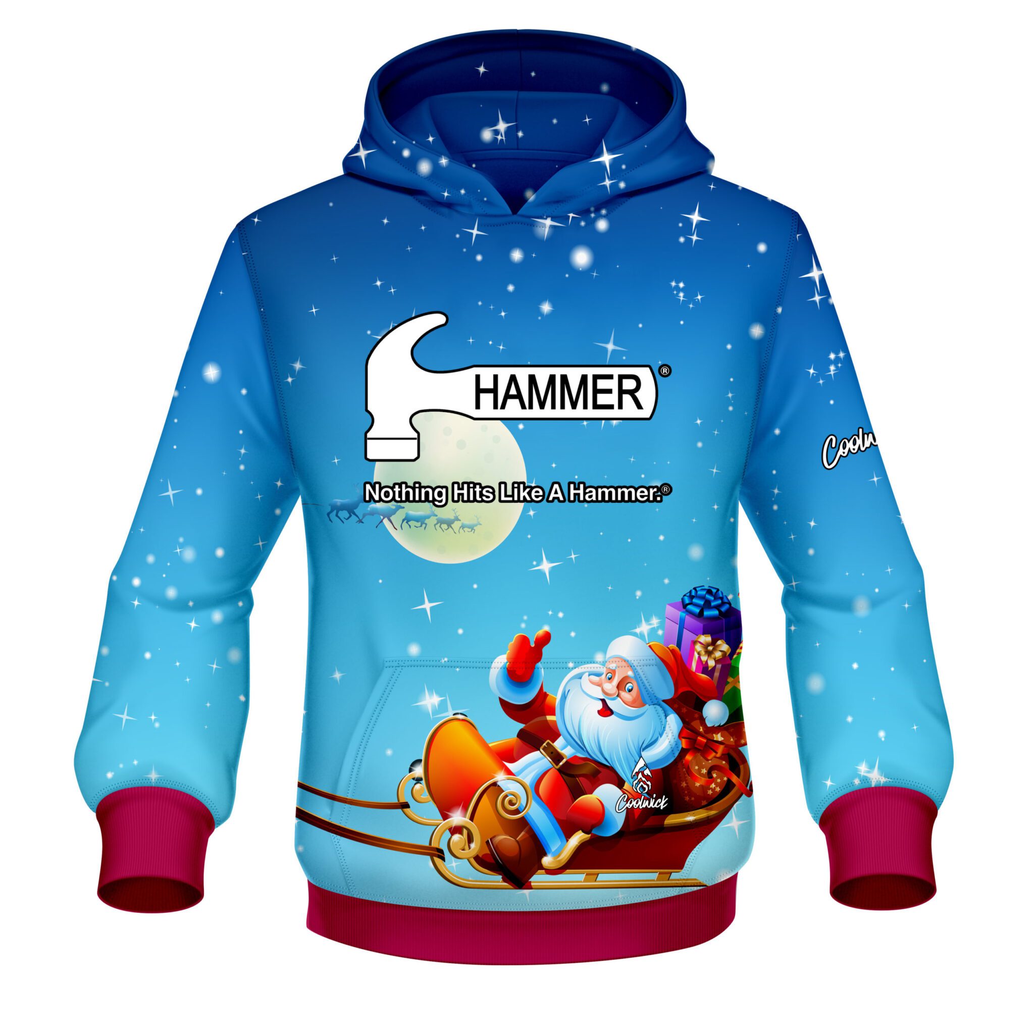 Designed, cut and sewn by hand our Hammer Santa Merry Christmas CoolWick Bowling Hoodies are made to keep you warm and comfy with HD graphics and eye catching style.