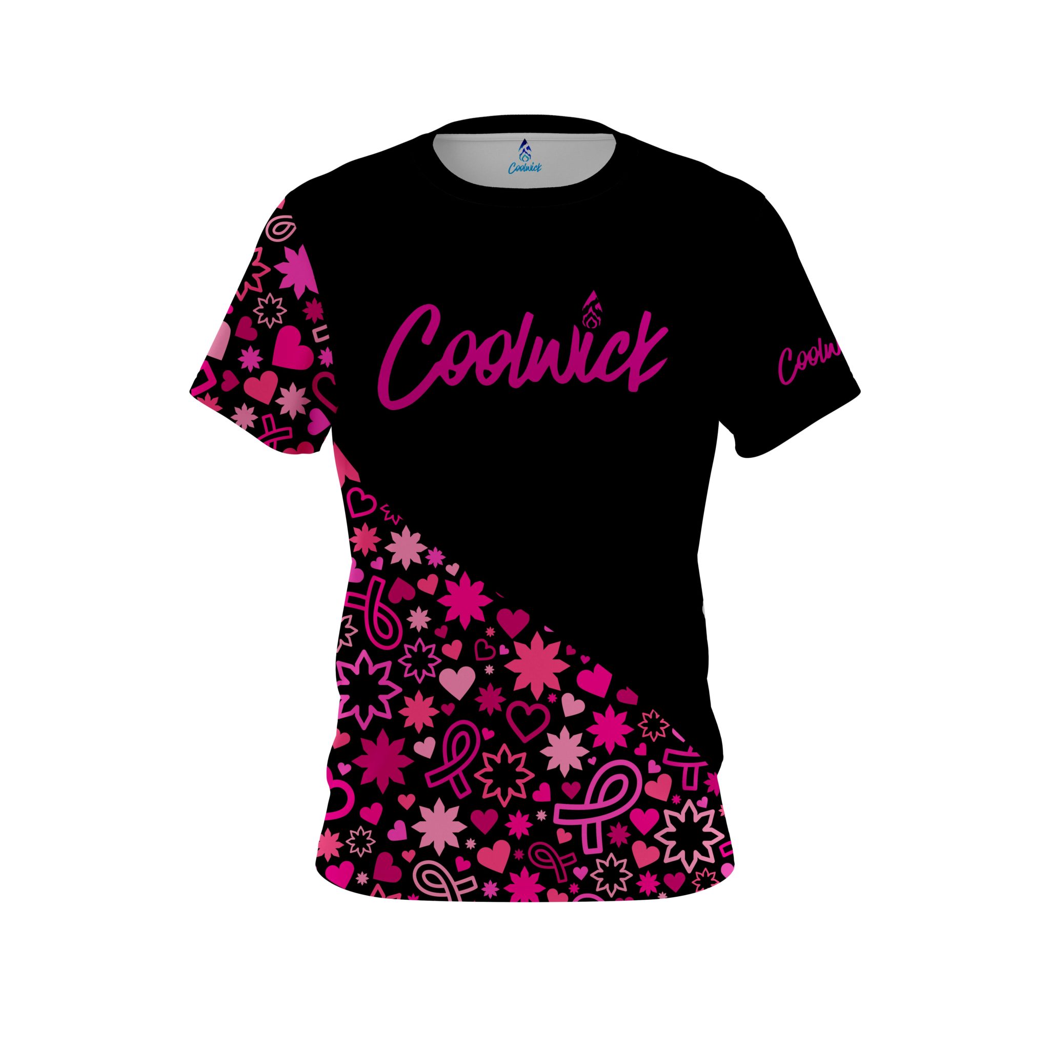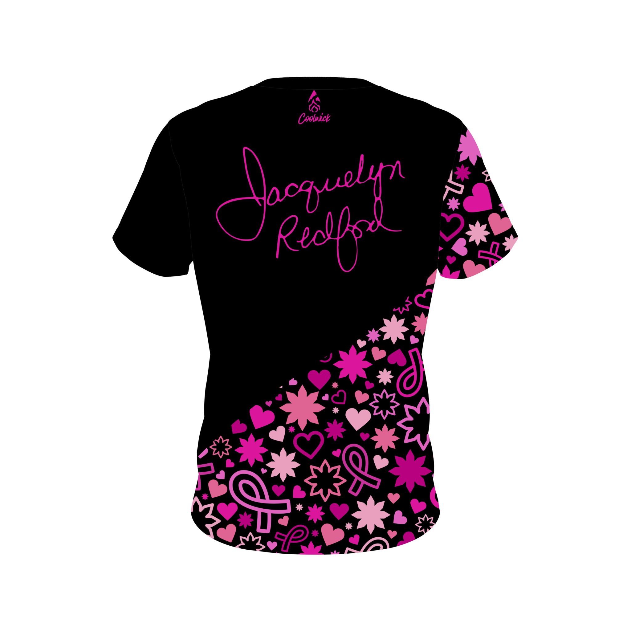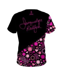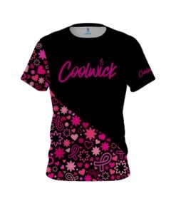 Stay 40% cooler with CoolWick. Our Jacquelyn Redford Breast Cancer CoolWick Bowling Jerseys are made of two different fabrics with the back being our CoolWick technology fabric that helps wick moisture away and helps air flow more easily through the fibers.