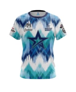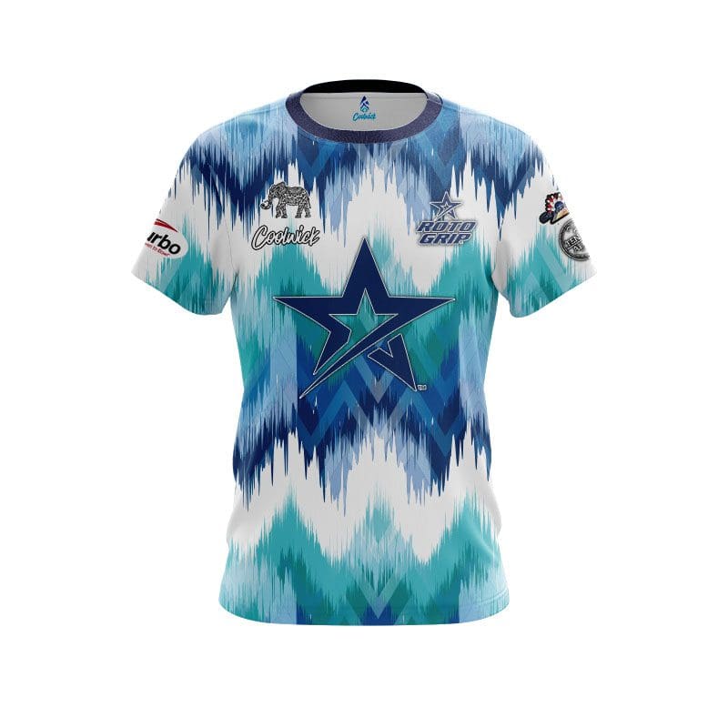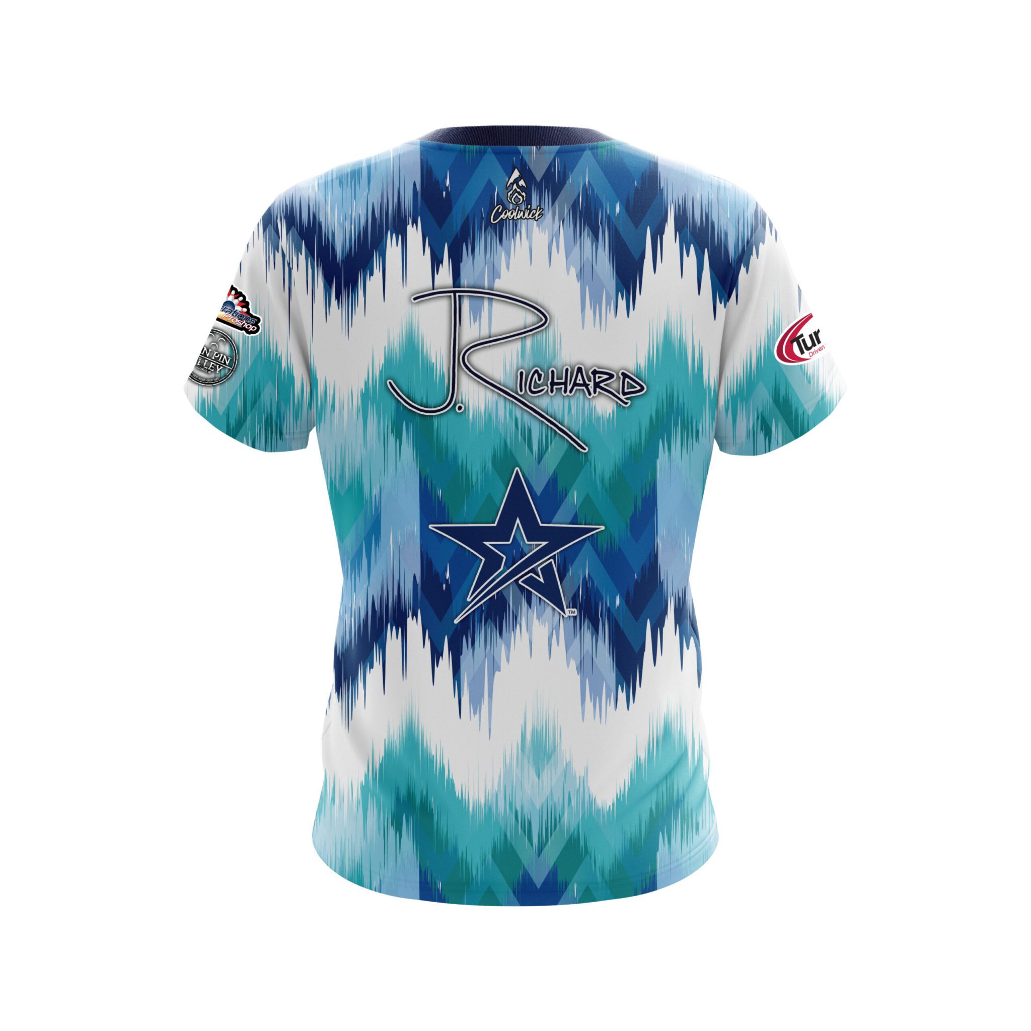 Stay 40% cooler with CoolWick. Our Jordan Richard Star Blue Teal Zig Zag Replica CoolWick Bowling Jerseys are made of two different fabrics with the back being our CoolWick technology fabric that helps wick moisture away and helps air flow more easily through the fibers.