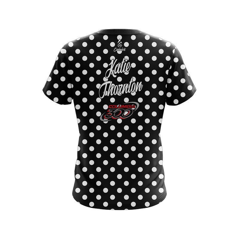 Designed, cut and sewn by hand stay 40% cooler with CoolWick. Our Katie Thornton Columbia 300 Polka Dots CoolWick Bowling Jerseys are made of two different fabrics with the back being our CoolWick technology fabric that helps wick moisture away and helps air flow more easily through the fibers.