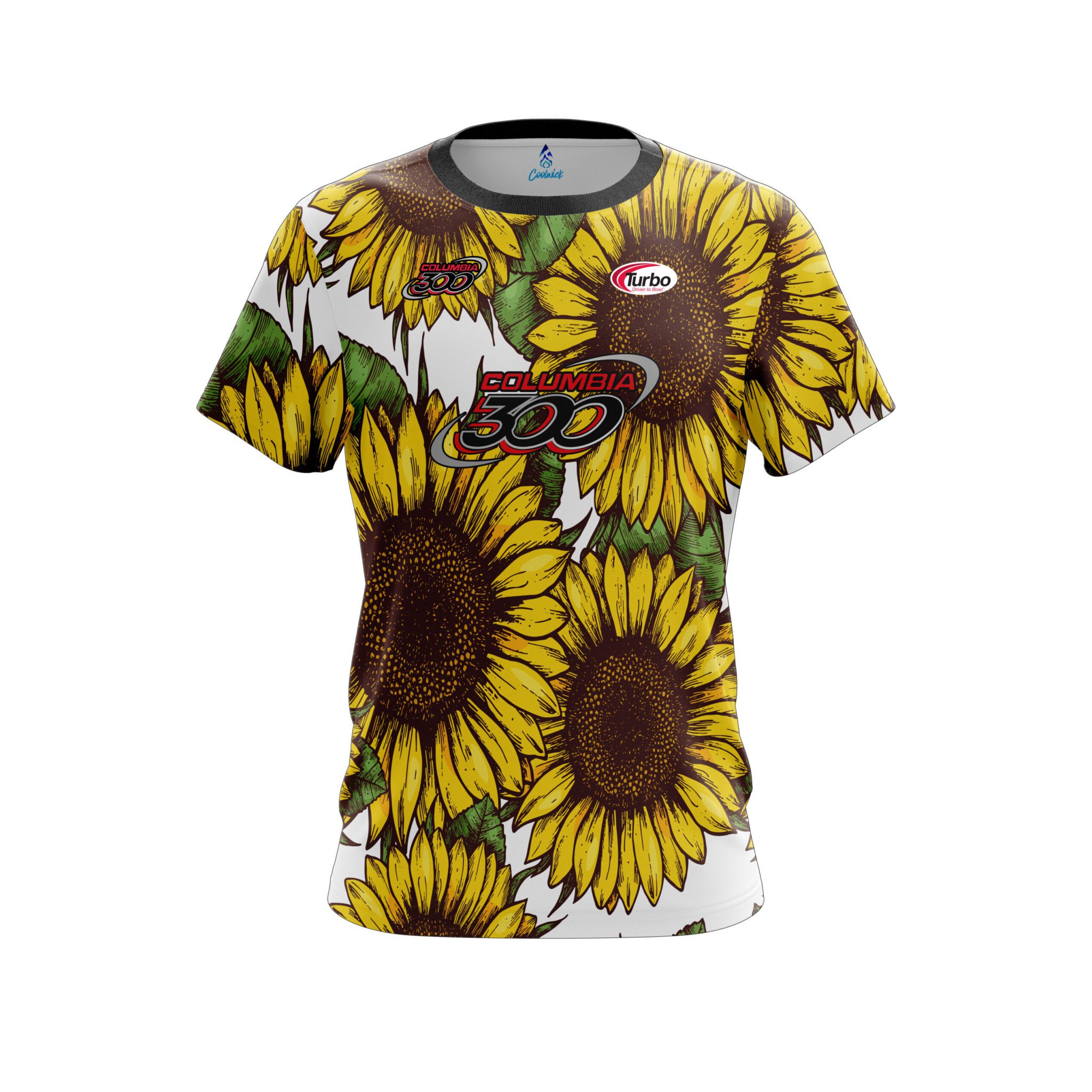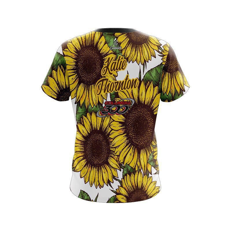 Designed, cut and sewn by hand stay 40% cooler with CoolWick. Our Katie Thornton Columbia 300 Sunflowers CoolWick Bowling Jerseys are made of two different fabrics with the back being our CoolWick technology fabric that helps wick moisture away and helps air flow more easily through the fibers.