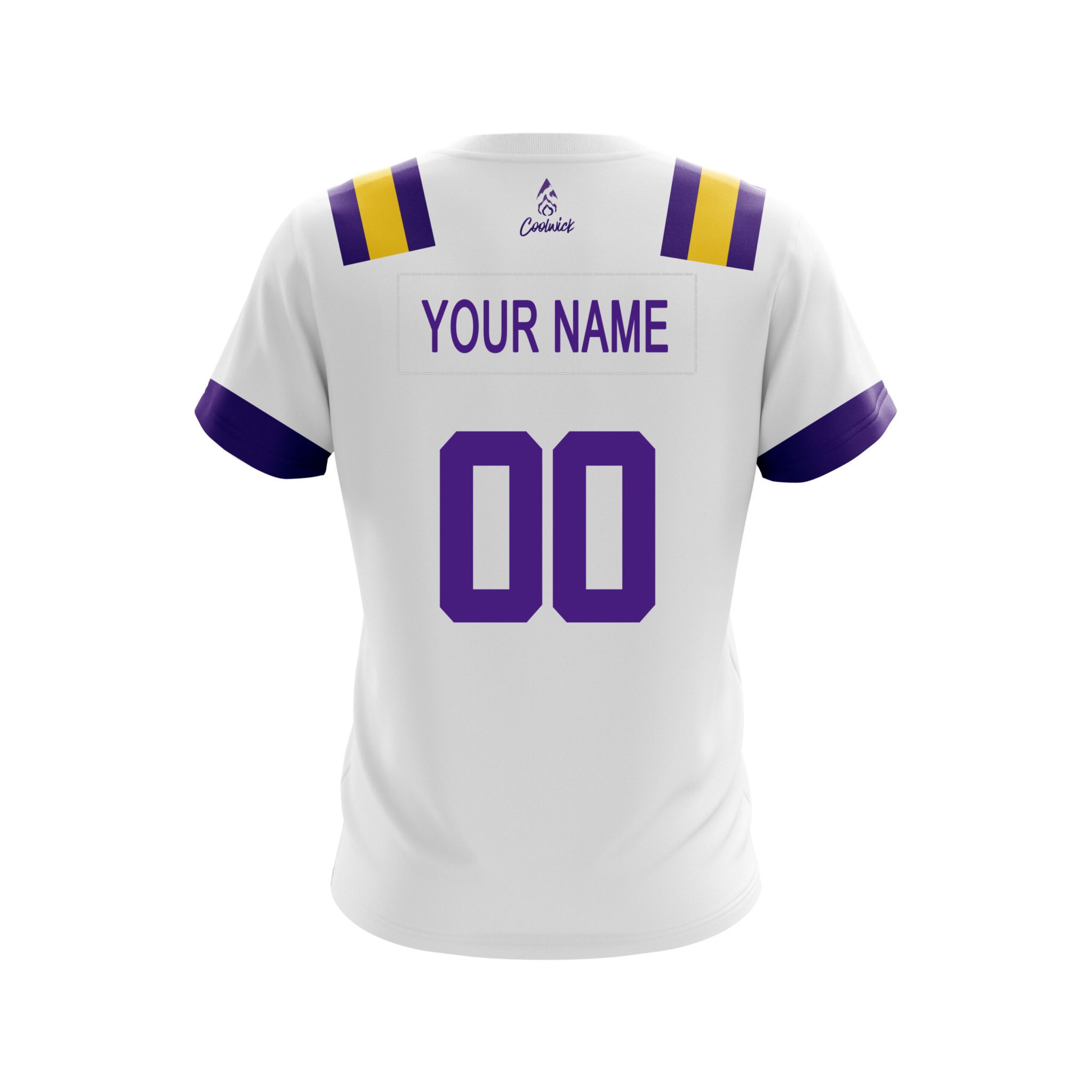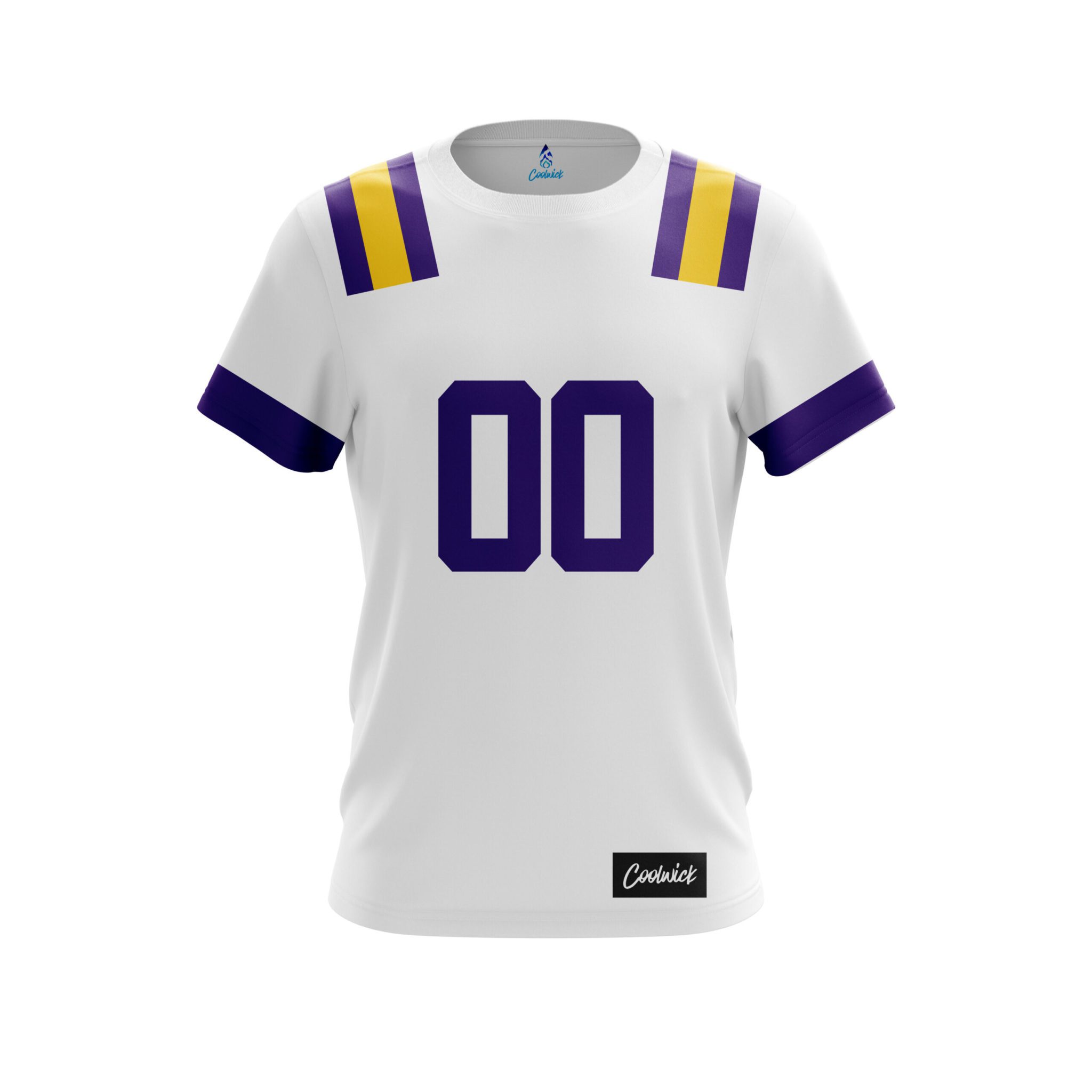 Designed, cut and sewn by hand stay 40% cooler with CoolWick. Our Louisiana Away Football CoolWick Bowling Jerseys are made of two different fabrics with the back being our CoolWick technology fabric that helps wick moisture away and helps air flow more easily through the fibers.