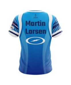 Designed, cut and sewn by hand stay 40% cooler with CoolWick. Our Martin Larsen Blue Replica CoolWick Bowling Jerseys are made of two different fabrics. The back being our CoolWick technology fabric that helps wick moisture away and helps air flow more easily through the fibers.