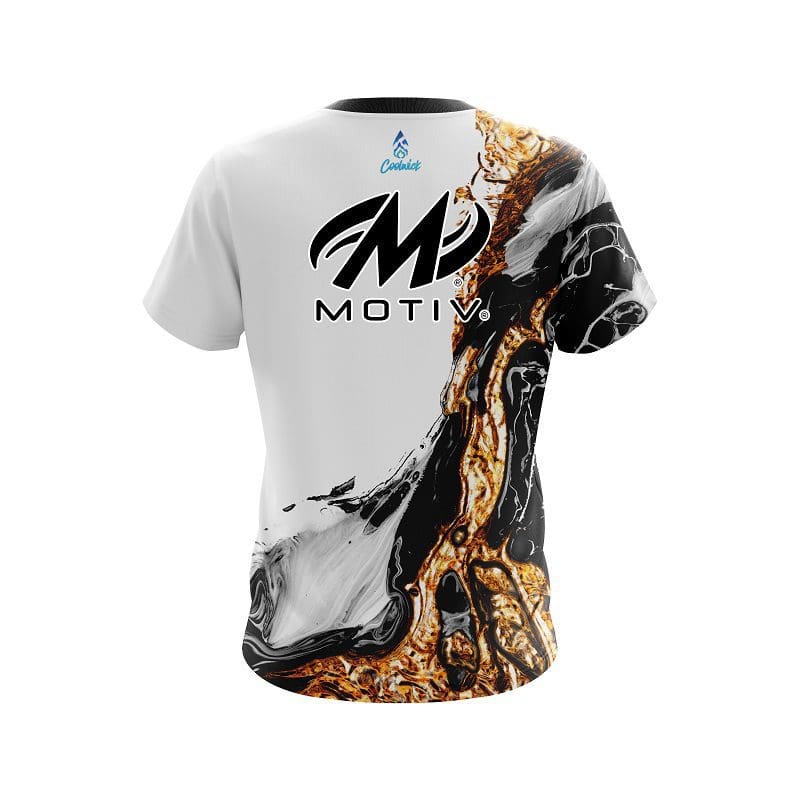 Stay 40% cooler with CoolWick. Our Motiv Black And Gold Liquid Marble CoolWick Bowling Jerseys are made of two different fabrics with the back being our CoolWick technology fabric that helps wick moisture away and helps air flow more easily through the fibers.