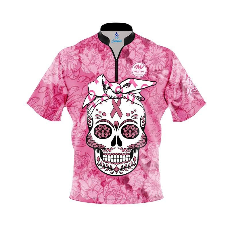 Our Fast Track jerseys come with a sash zip collar at no extra charge! There are no additional logos in order to ensure speedy production of your Motiv Breast Cancer Mashup Fast Track CoolWick Bowling Jersey, which will complete the production process in 7 to 14 Days!