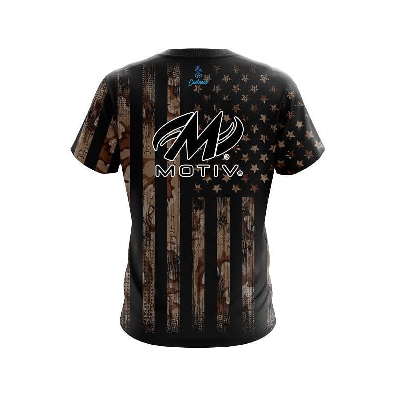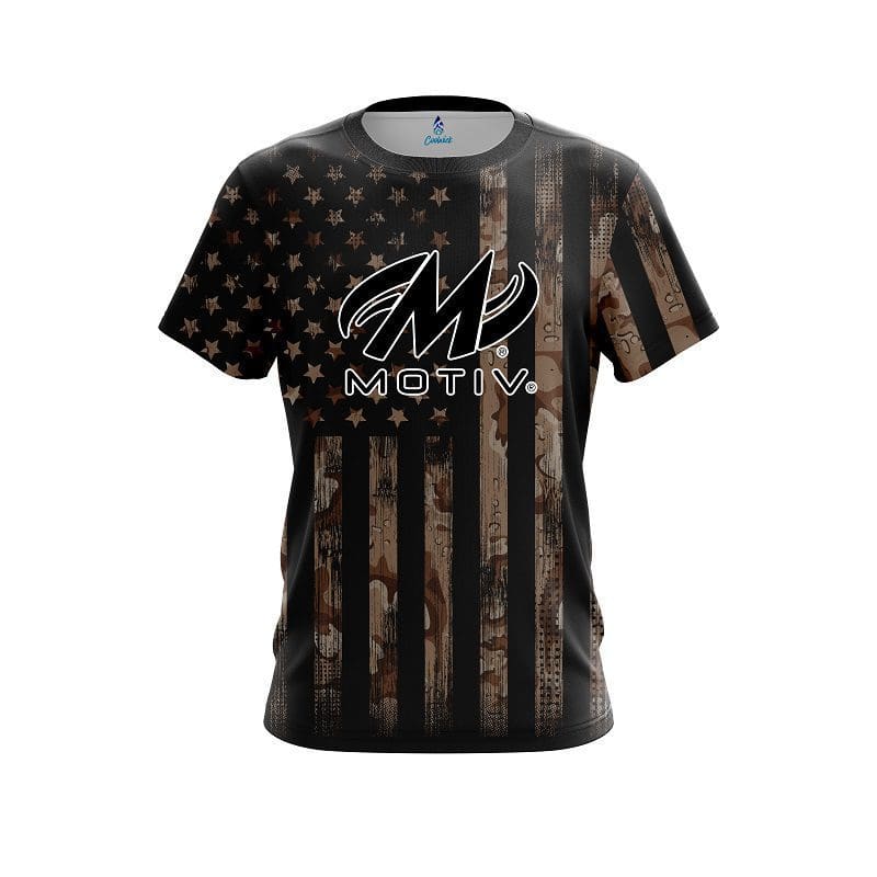 Stay 40% cooler with CoolWick. Our Motiv Desert Camo Flag CoolWick Bowling Jerseys are made of two different fabrics with the back being our CoolWick technology fabric that helps wick moisture away and helps air flow more easily through the fibers.