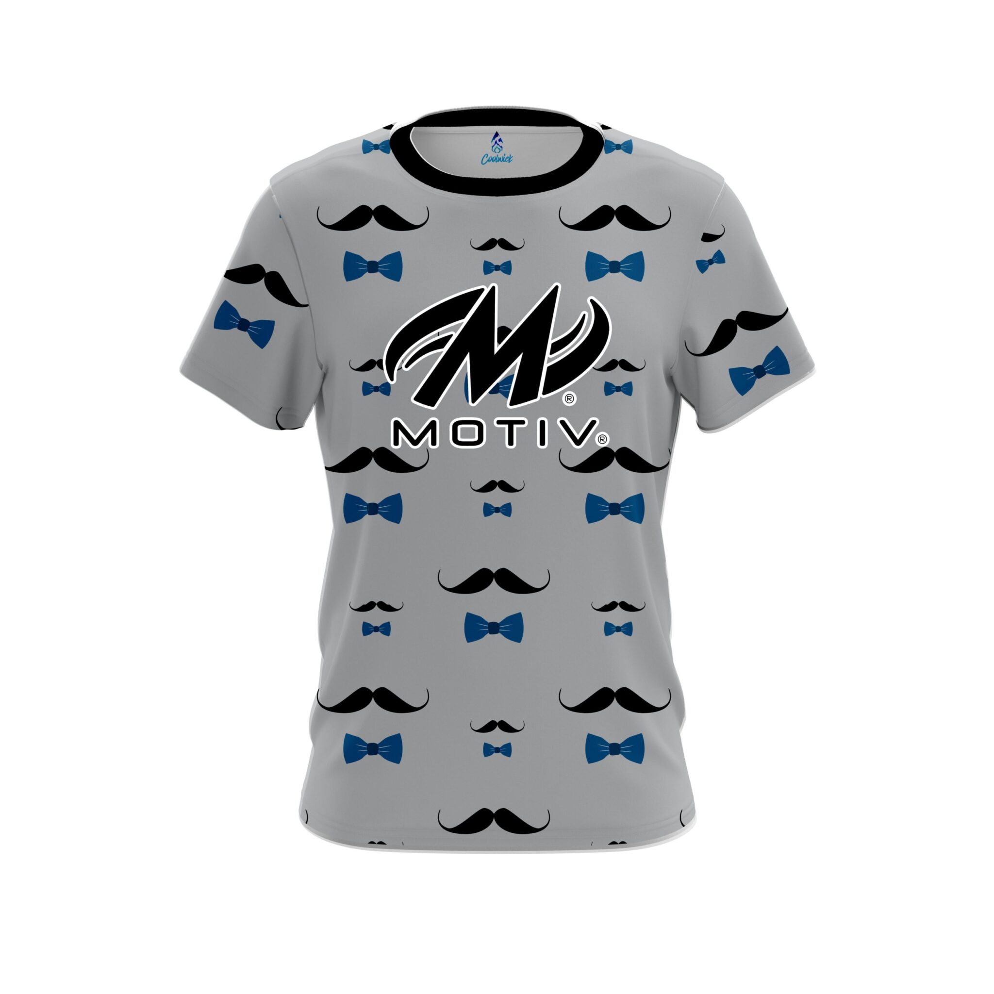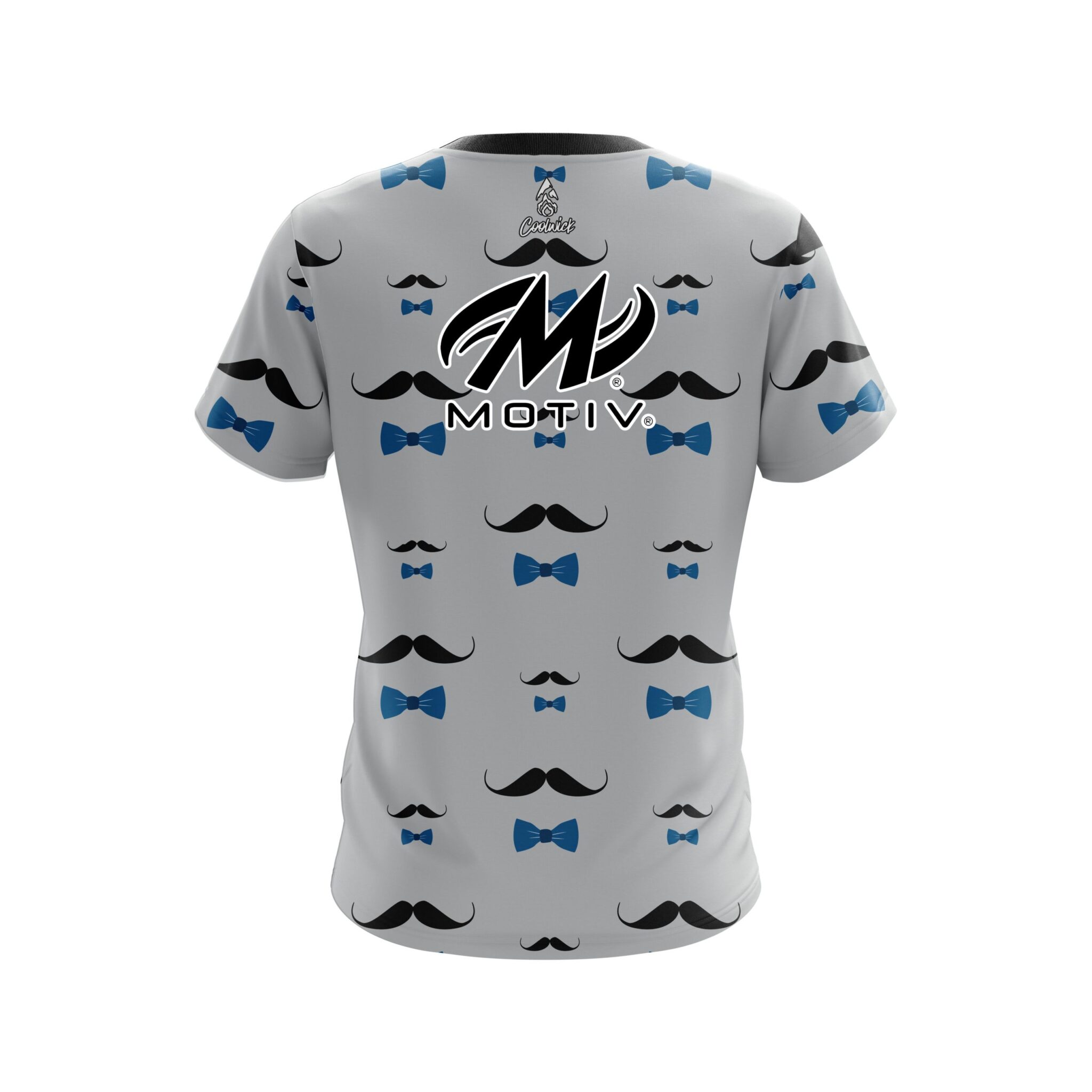 Stay 40% cooler with CoolWick. Our Motiv Grey Blue Mustache CoolWick Bowling Jerseys are made of two different fabrics with the back being our CoolWick technology fabric that helps wick moisture away and helps air flow more easily through the fibers.