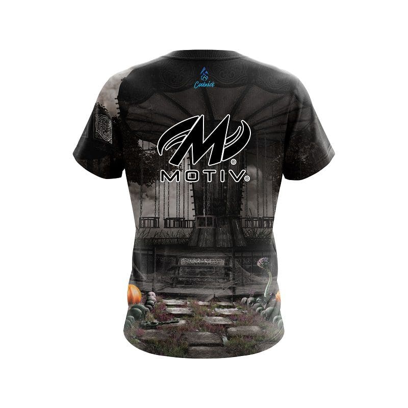 Stay 40% cooler with CoolWick. Our Motiv Spooky Carnival Carousel CoolWick Bowling Jerseys are made of two different fabrics with the back being our CoolWick technology fabric that helps wick moisture away and helps air flow more easily through the fibers.
