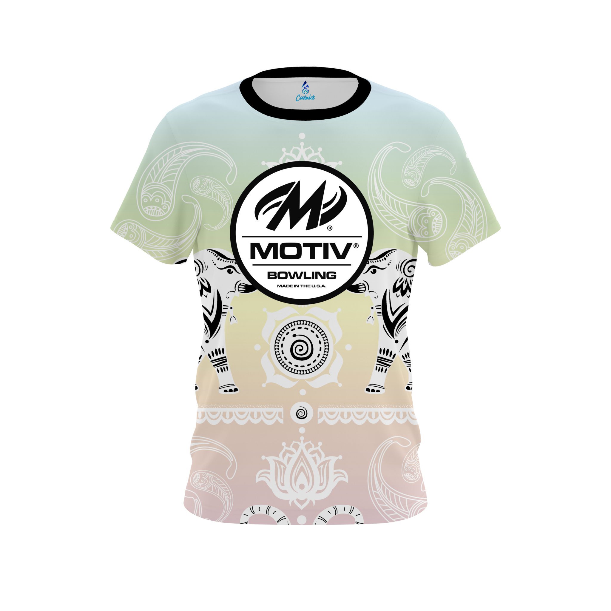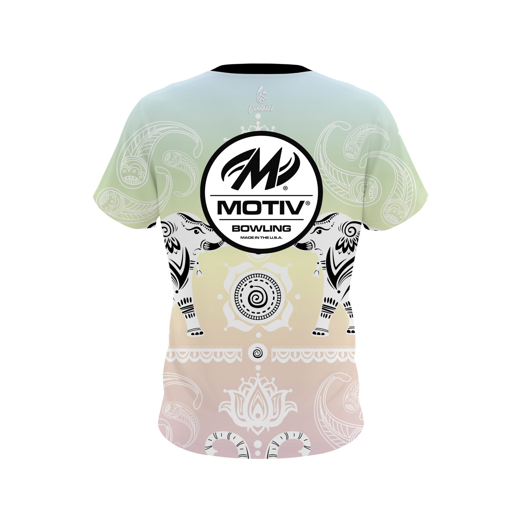 Stay 40% cooler with CoolWick. Our Motiv Tribal Elephants Pastel Rainbow CoolWick Bowling Jersey are made of two different fabrics with the back being our CoolWick technology fabric that helps wick moisture away and helps air flow more easily through the fibers.