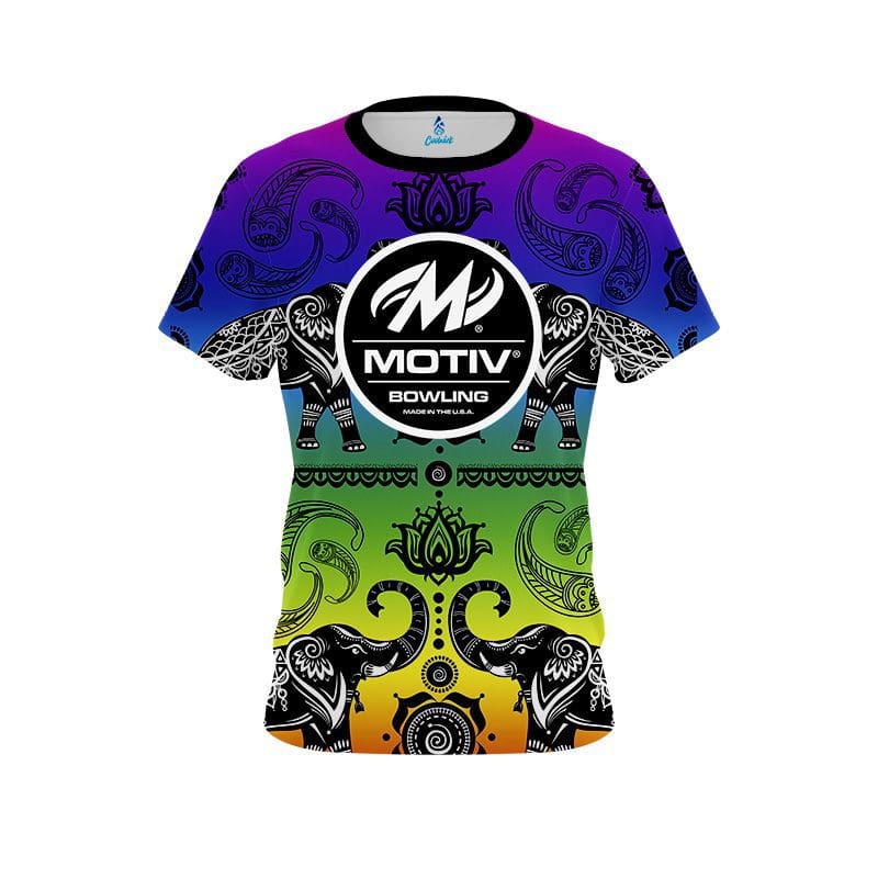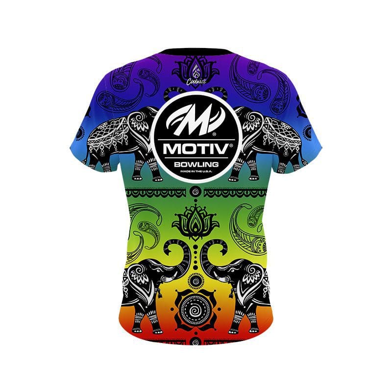 Stay 40% cooler with CoolWick. Our Motiv Tribal Elephants Rainbow CoolWick Bowling Jersey are made of two different fabrics with the back being our CoolWick technology fabric that helps wick moisture away and helps air flow more easily through the fibers.