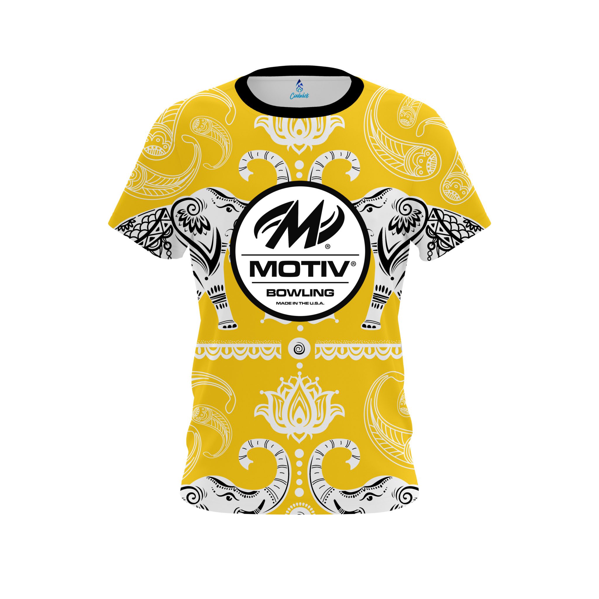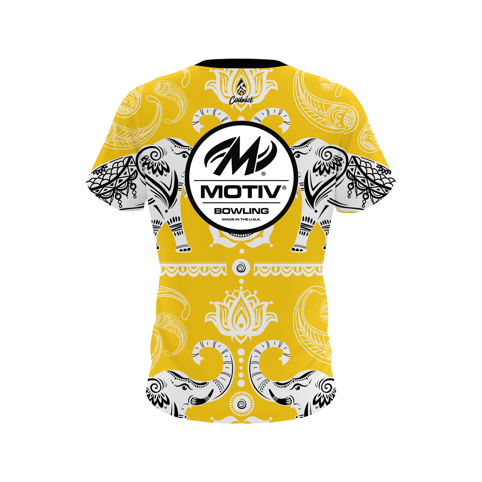 Stay 40% cooler with CoolWick. Our Motiv Tribal Elephants Yellow CoolWick Bowling Jersey are made of two different fabrics with the back being our CoolWick technology fabric that helps wick moisture away and helps air flow more easily through the fibers.