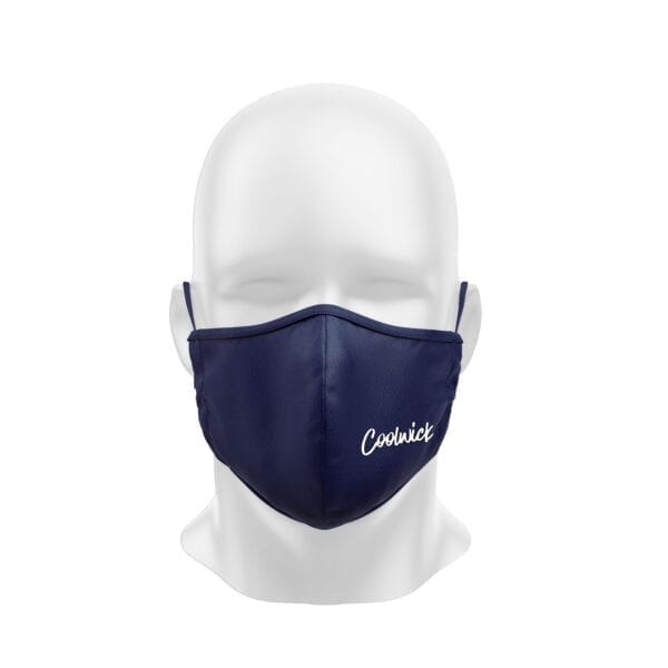Stay 40% cooler with CoolWick. Our Navy Blue dye sublimated masks are two-ply and 100% polyester that covers the wearer’s nose and mouth. Our masks are made of fabric that helps wick moisture away and helps air flow more easily through the fibers. The fabric binding has a slight stretch, while ear loops and a center seam help hold it comfortably in place all day.